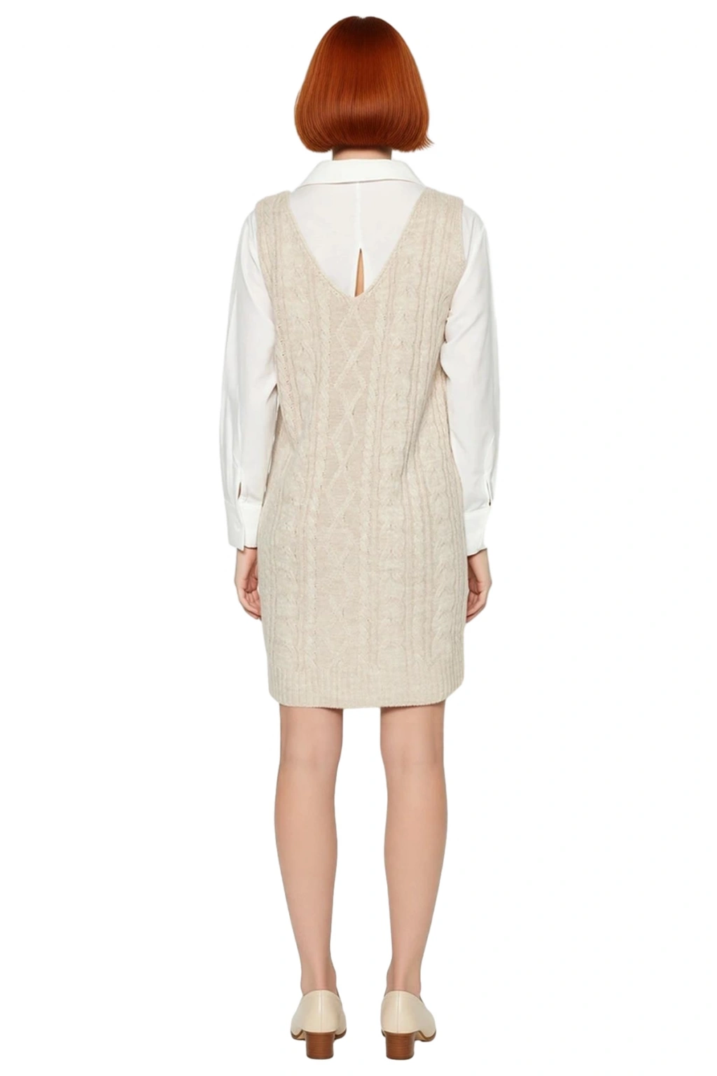 V yaka tasarımı, boynunuzu zarifçe vurgulayarak feminen bir görünüm sağlarken, kolsuz yapısı farklı bluz veya gömleklerle, hatta ince kazaklarla katmanlı kombinler yapma özgürlüğü sunar. Orta kalınlıktaki triko kumaş dokusu, hava geçiren yapısıyla ilkbahar ve sonbahar günlerinde ideal bir sıcaklık dengesi sunar, gün boyu rahatlık sağlar. Cepsiz ve astarsız tasarımı, minimalist ve akıcı bir duruş sergileyerek gereksiz hacimden kaçınır. Tek plaka dokuma tekniği ile üretilen bu elbise, dayanıklı yapısıyla uzun ömürlü kullanım vaat ederken, T41 yıkama talimatları sayesinde pratik bir bakım kolaylığı sunar.