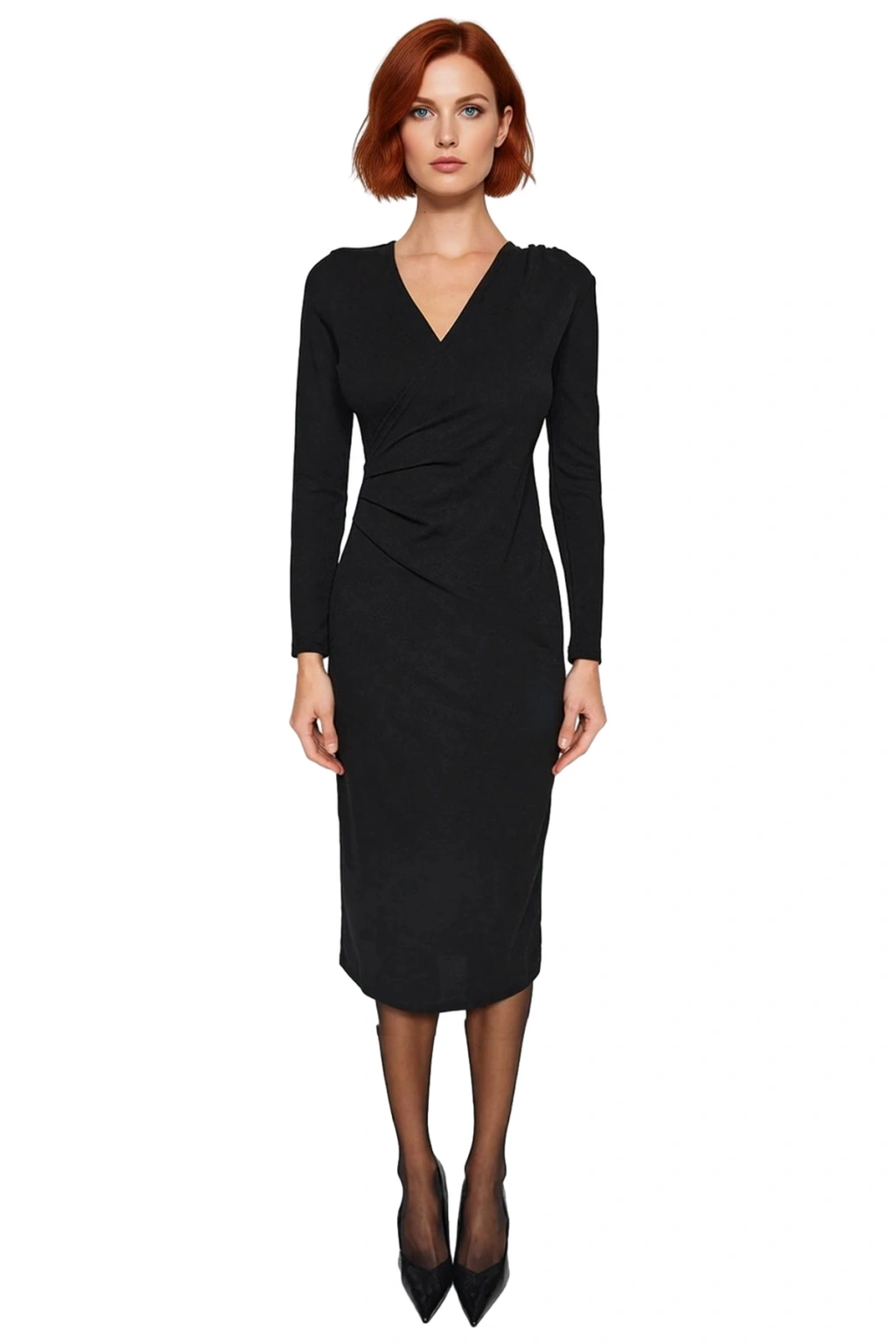 Ürün Özellikleri: Bodycon kalıp, polyester elastan materyal, düz desen, V yaka, standart kol, örme kumaş, siyah renk.