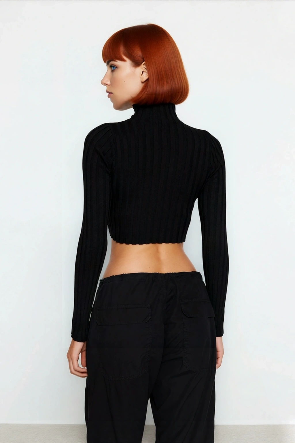 Ürün Özellikleri: Fitted kalıp, %72 Viskoz %28 Polyester materyal, düz desen, dik yaka, standart kol, triko kumaş, siyah renk, süper crop boy, asimetrik siluet.
