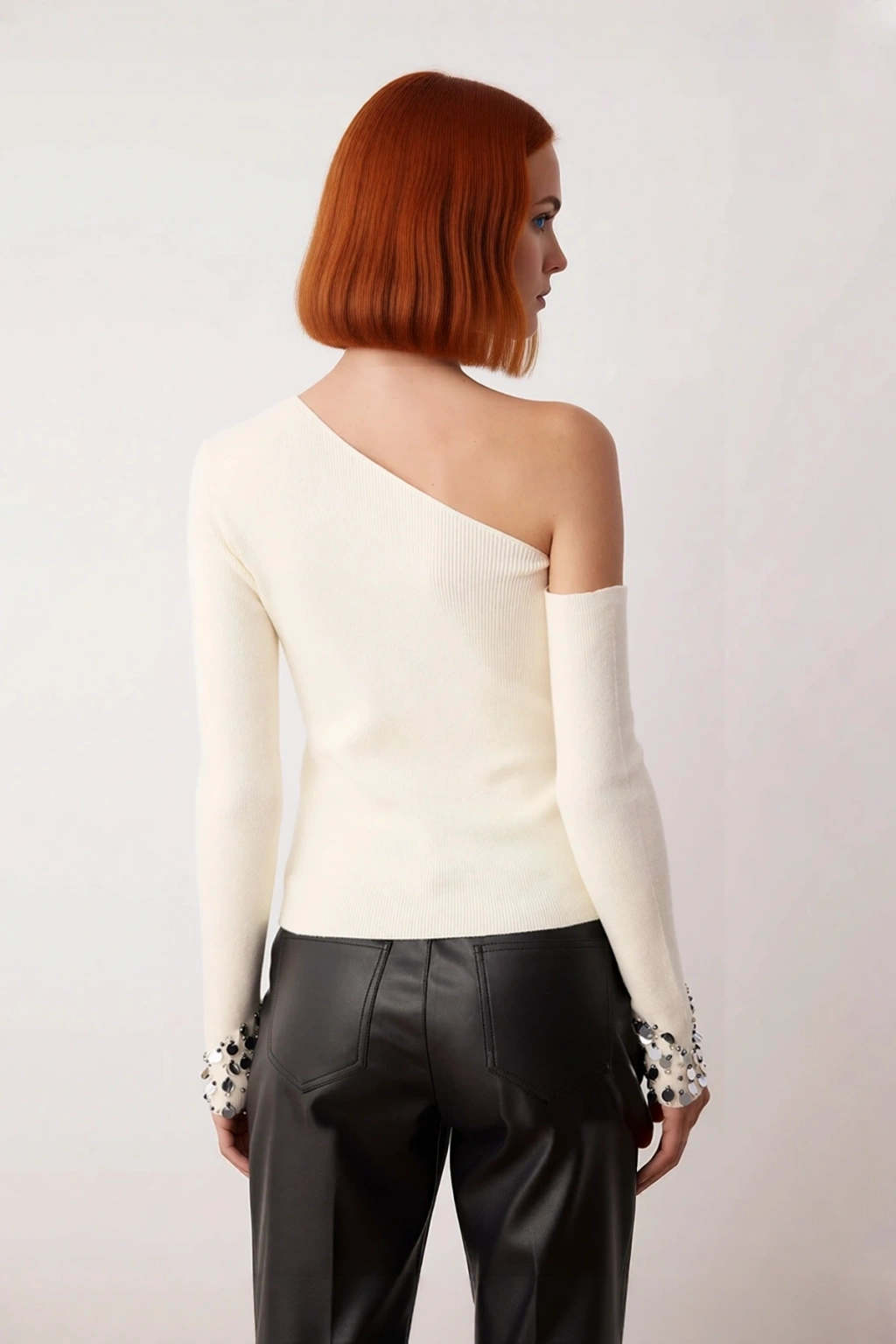 Asimetrik yaka tasarımı, omuzları zarifçe açıkta bırakarak feminen bir dokunuş katarken, ürünün dikkat çekici ana özelliğini oluşturur. Düşük kol kesimi ve uzun kol boyu, gün boyu süren rahatlık ve hareket özgürlüğü sunar. Triko kumaş tipi, orta kalınlığı sayesinde ilkbahar ve sonbaharın serin günlerinde ideal sıcaklık sağlarken, nefes alabilen yapısıyla cildinize dosttur ve alerjik reaksiyonlara neden olmaz. Çift plaka dokuma tekniği, ürünün dayanıklılığını artırarak uzun süreli kullanım imkanı sunar ve formunu korur. Kol uçlarındaki özenle işlenmiş payetler, her adımda ışıldayarak özel anlara değer katar ve stilinize parlak bir dokunuş ekler. Makinede uygun yıkama talimatlarına uyulduğunda bakımı oldukça kolaydır.