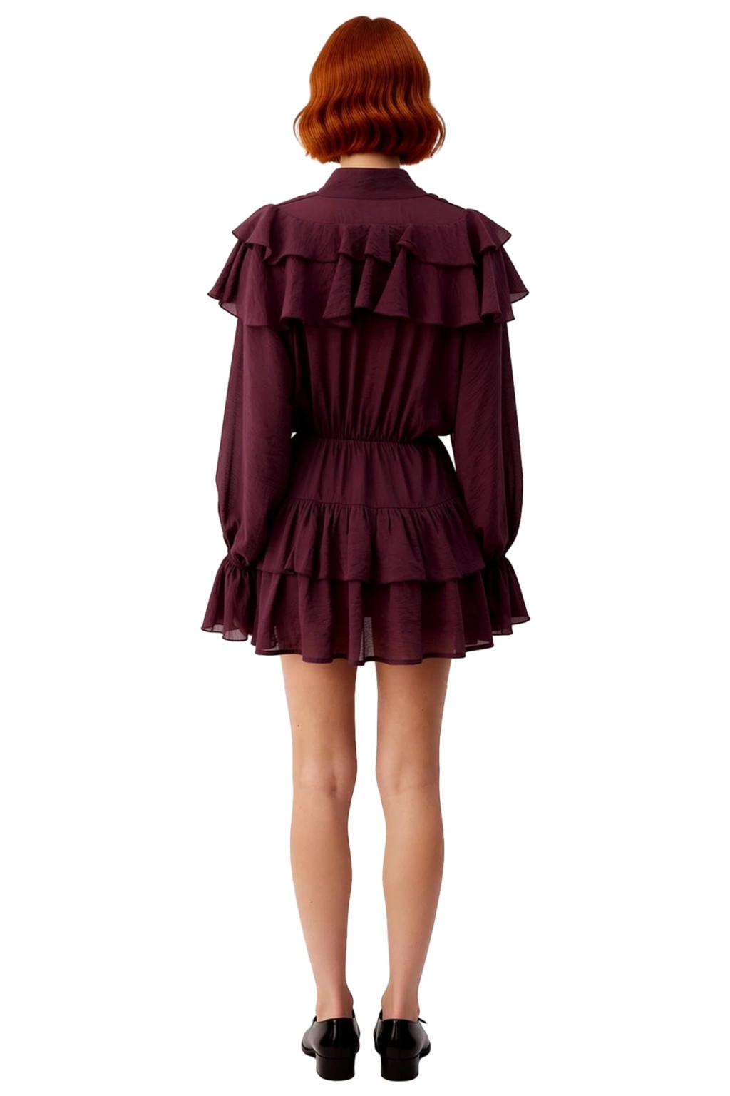 Ürün Özellikleri: Skater kalıp, %100 polyester materyal, düz desen, fular yaka, balon kol, dokuma şifon kumaş, bordo renk, astarlı tasarım.