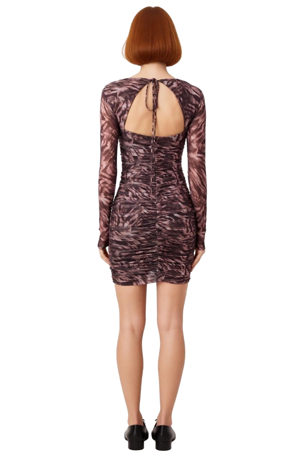Ürün Özellikleri: Bodycon kalıp, 94% Polyester 6% Elastan materyal, animal desen, kalp yaka, uzun standart kol, örme tül kumaş, çok renkli.