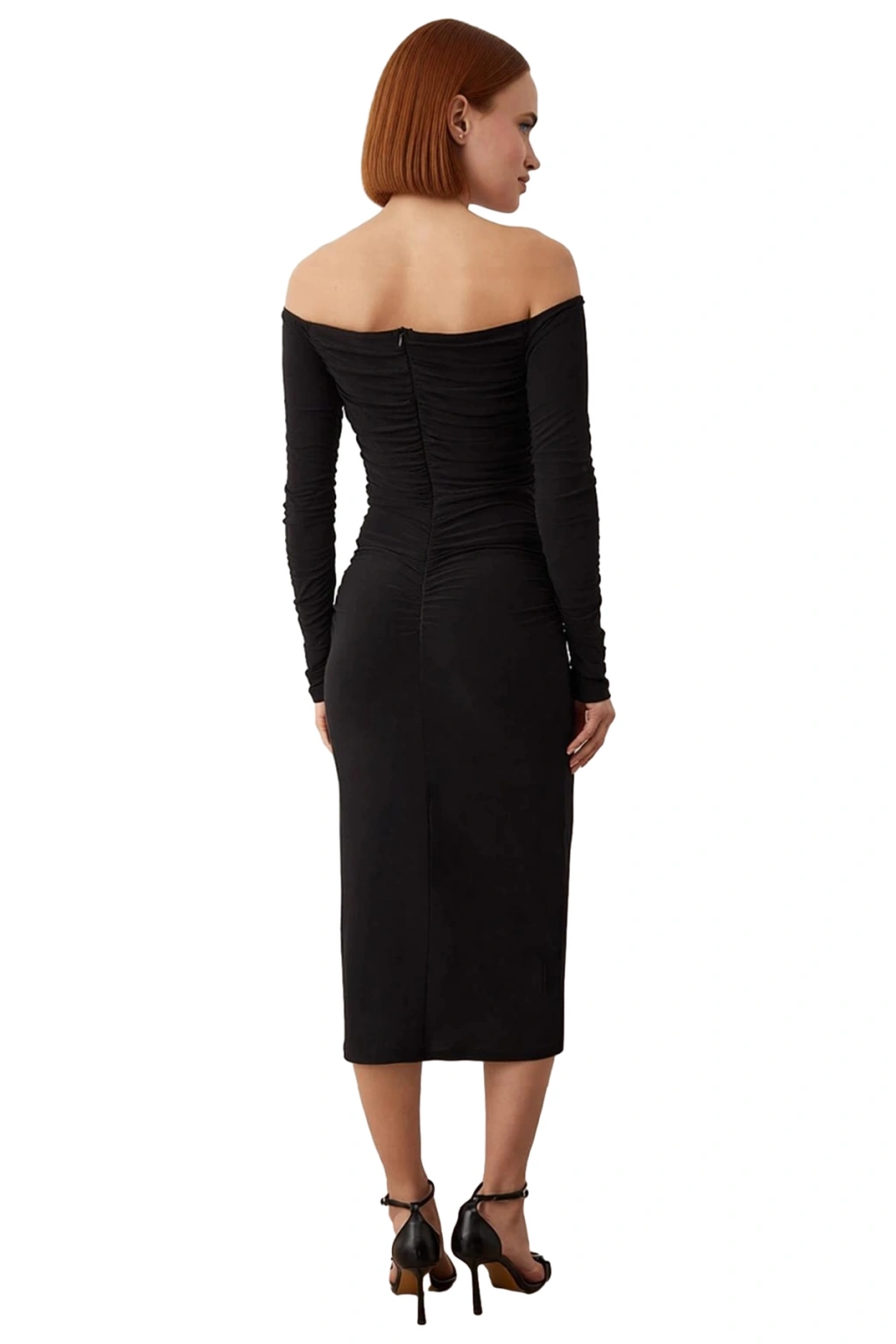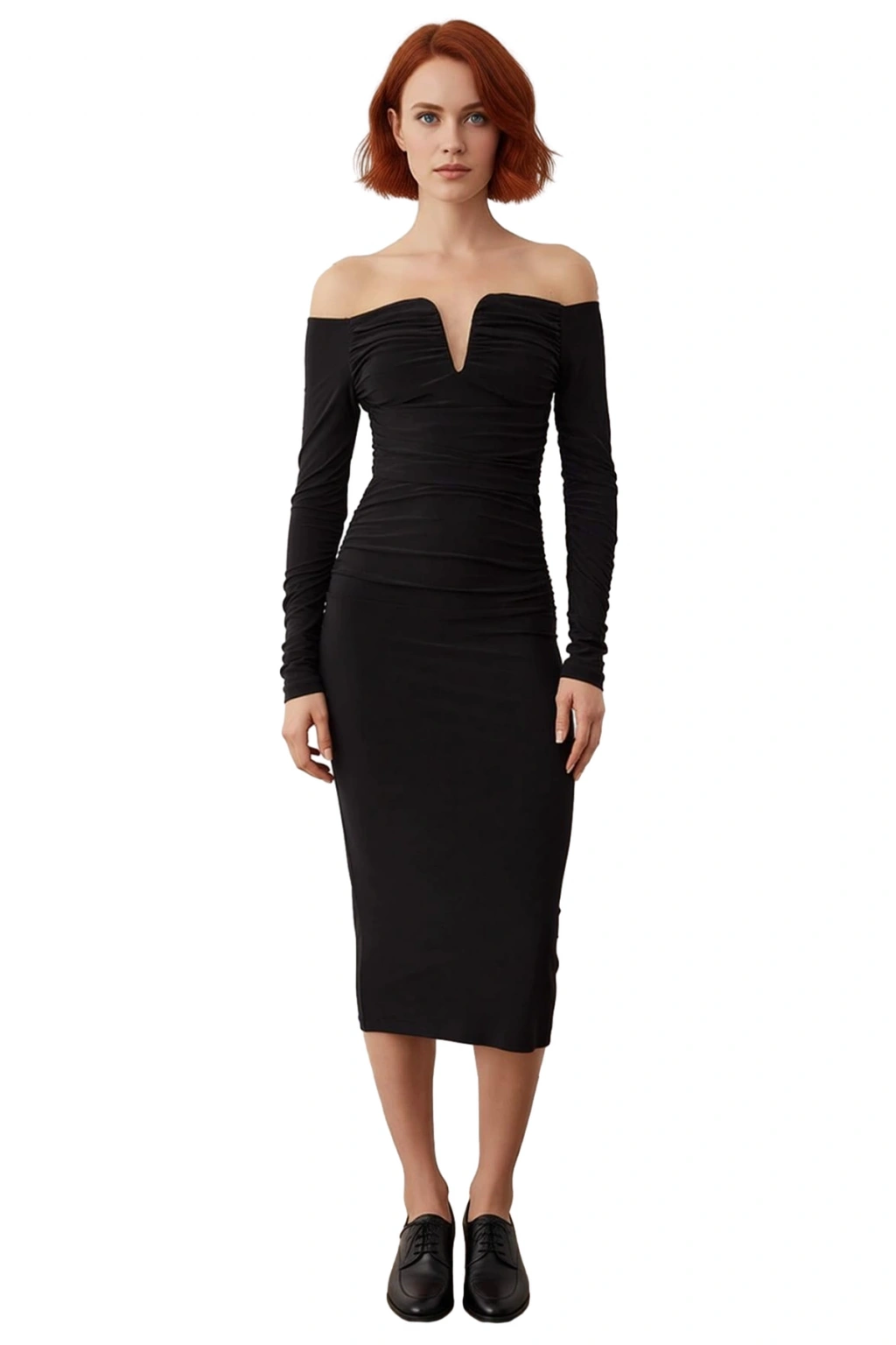 Carmen yaka tasarımı omuzlarınızı zarifçe ortaya çıkarırken, uzun standart kolları soğuk havalarda bile şık bir görünüm sergiler. Örme kumaş tipi ve sandy dokuması, cildinize nazik bir temas sunar ve elbisenin vücudu saran bodycon kalıbını tamamlar. Büzgülü ve drape detayları, elbisenin genelinde estetik bir derinlik yaratır ve kadınsı hatları mükemmel bir şekilde vurgular. Astarsız olmasına rağmen kaliteli materyali sayesinde iç göstermez, kolayca yıkanabilir ve ütü gerektirmeyen yapısıyla bakımı oldukça kolaydır. Uzun ömürlü kullanım vadeden bu elbise, gardırobunuzun en gözde parçalarından biri olmaya adaydır.
