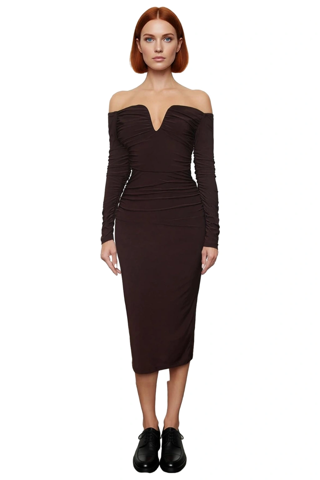 Ürün Özellikleri: Bodycon kalıp, polyester materyal, düz desen, carmen yaka, standart kol, örme kumaş, kahverengi renk, büzgülü tasarım.