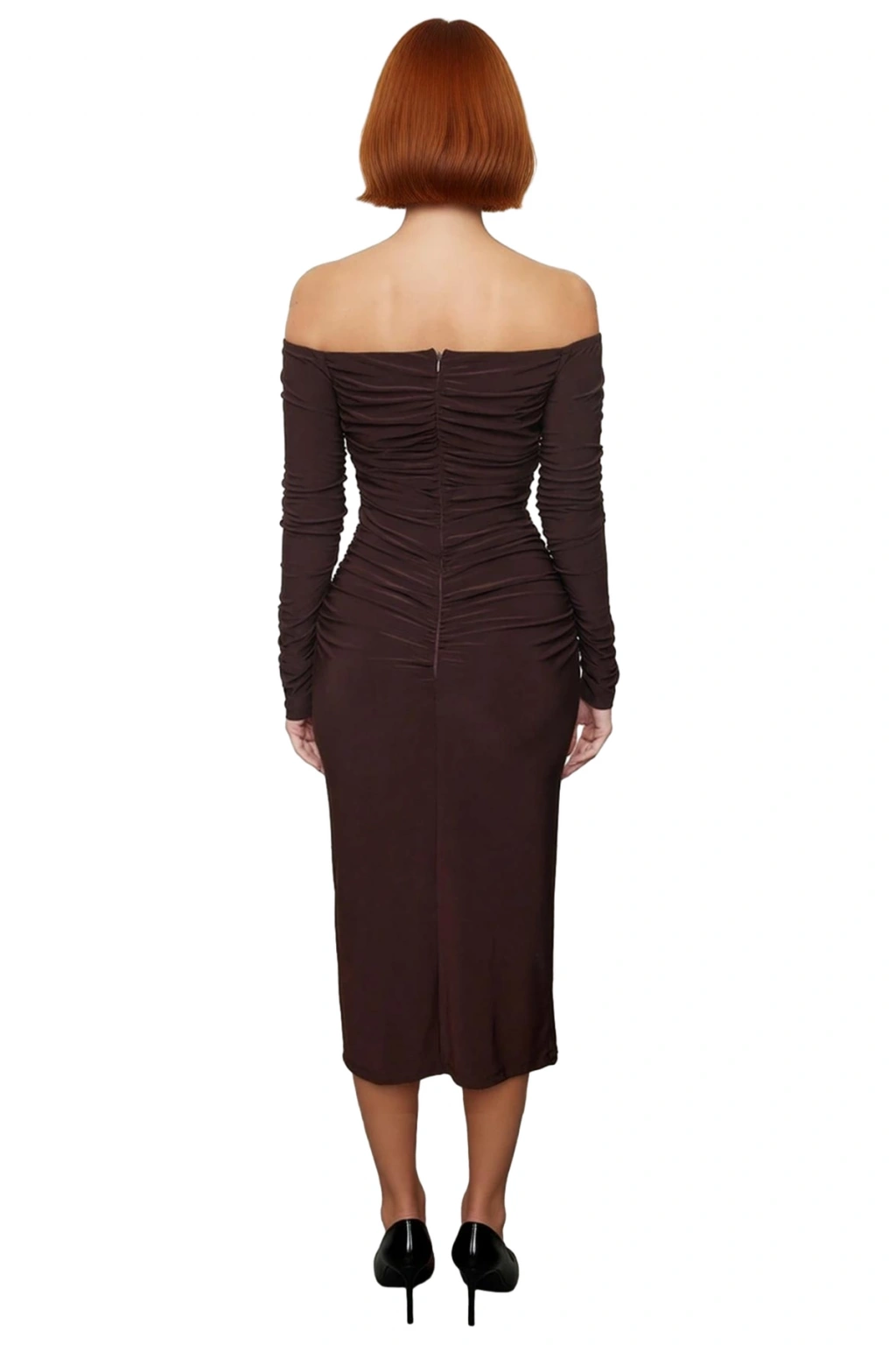Ürün Özellikleri: Bodycon kalıp, polyester materyal, düz desen, carmen yaka, standart kol, örme kumaş, kahverengi renk, büzgülü tasarım.