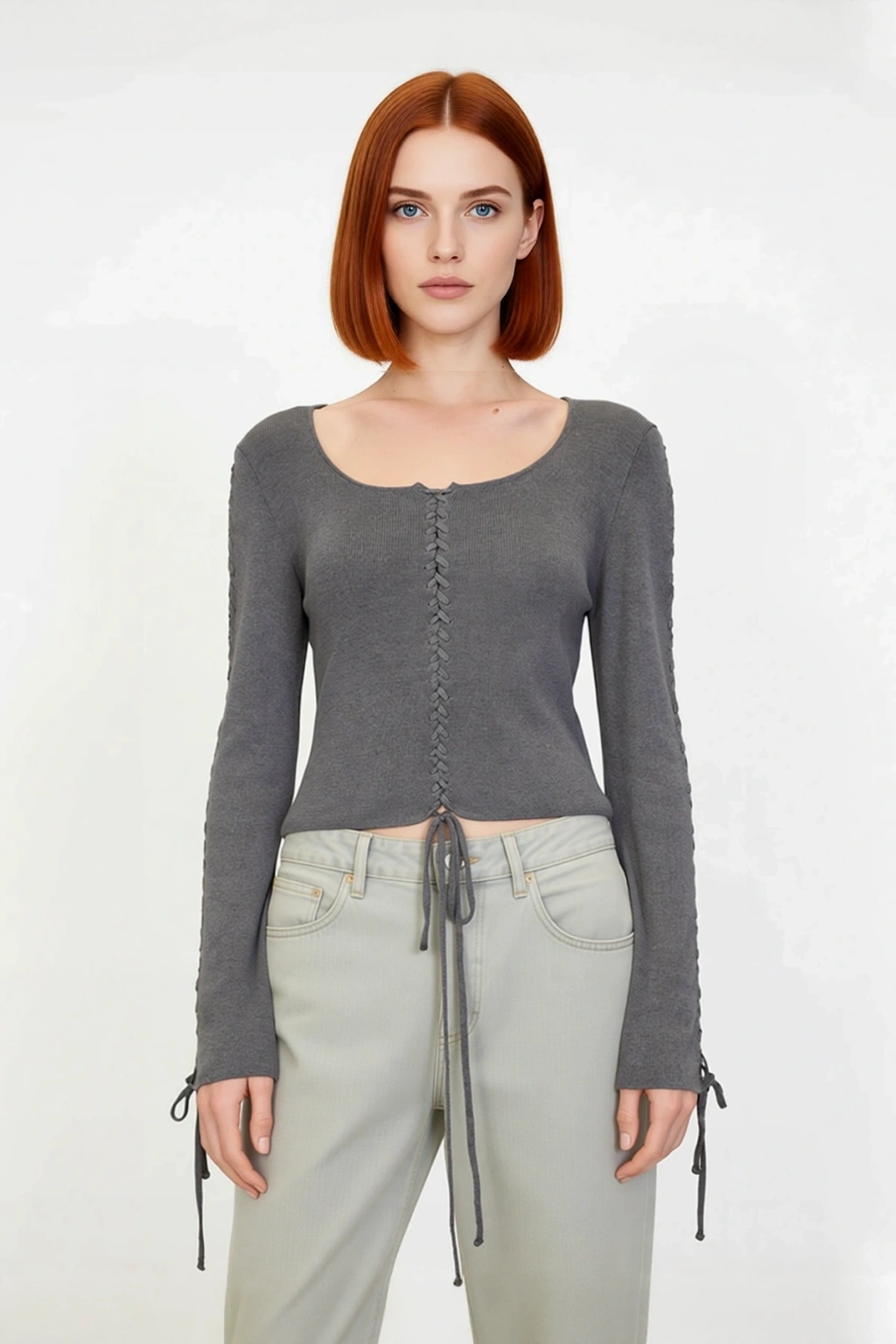 Bu kadın triko kazak, fitted kalıbı sayesinde vücuda mükemmel oturarak zarif bir siluet sunar. Ön kısmındaki ve kollarındaki özel iplik bağcık detayları ile modern ve dikkat çekici bir stil yaratır. Yüksek kaliteli 52% Akrilik ve 48% Viskoz materyal bileşimi, kazak orta kalınlığı ile hem sıcak tutar hem de inanılmaz yumuşak bir dokunuş hissi verir. Gri rengi ve düz deseni, bağcık detaylarının öne çıkmasını sağlarken, kış ve sonbahar aylarının soğuk günlerinde şıklığınızdan ödün vermeden rahat etmenizi sağlar.