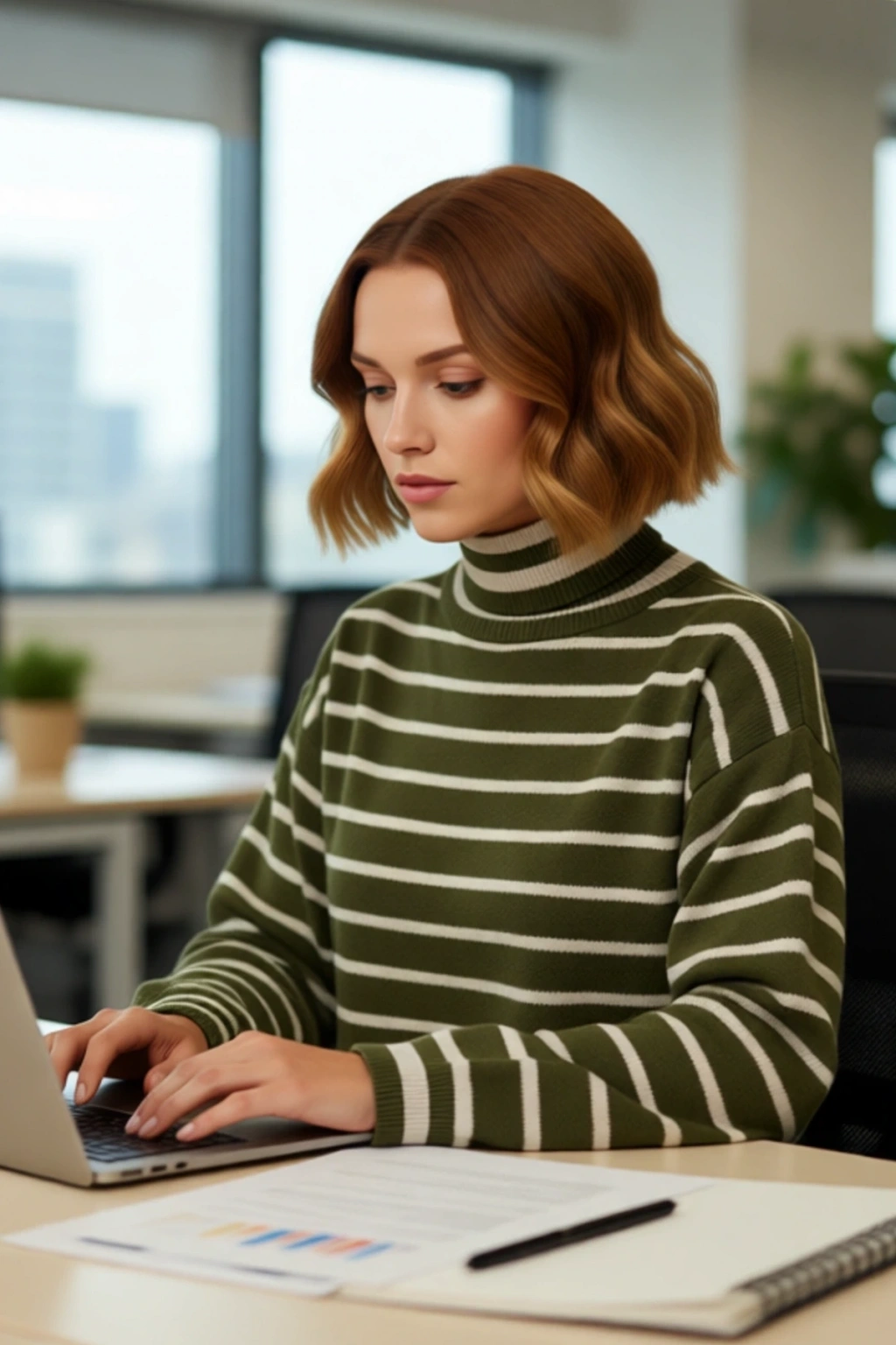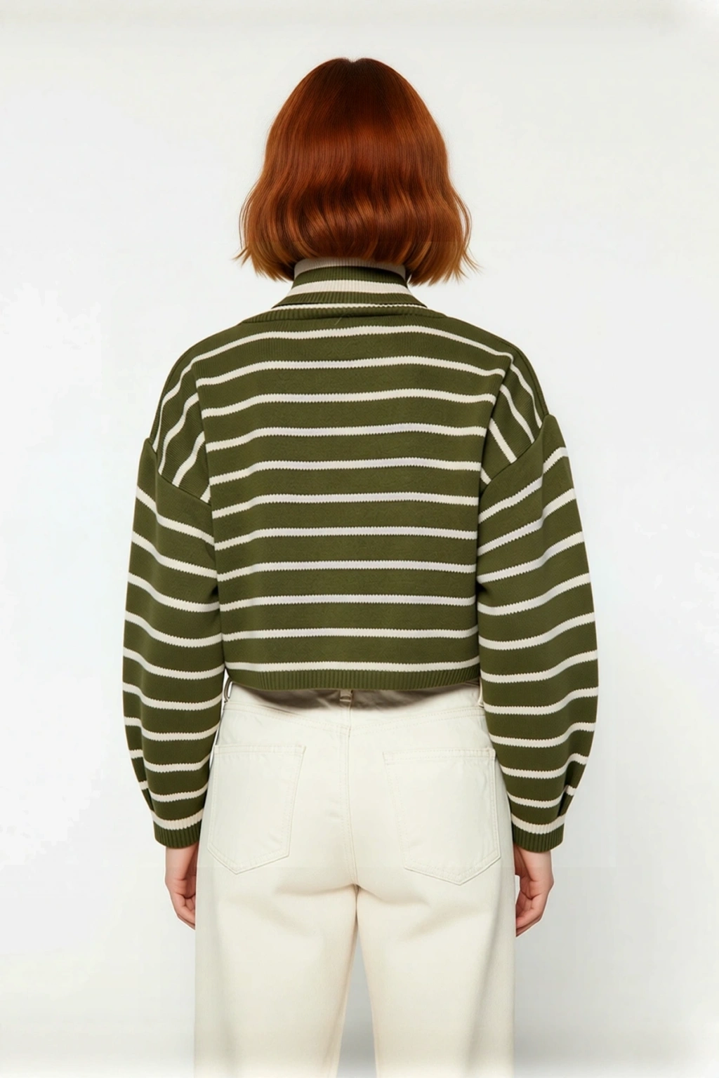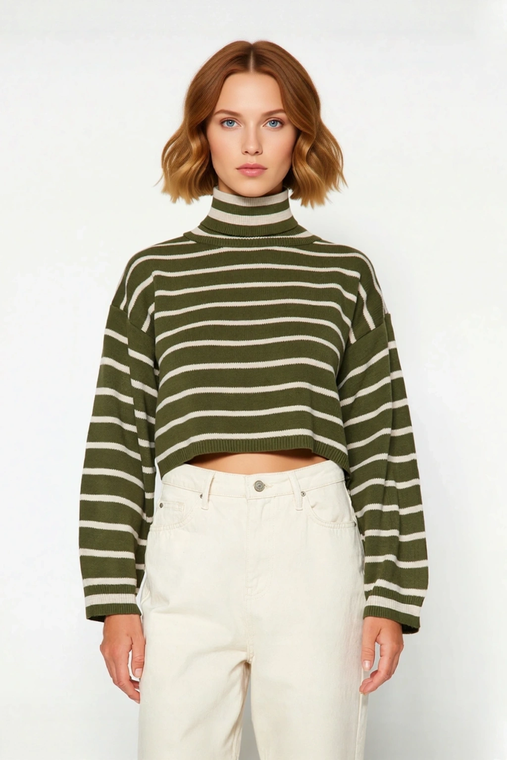 Ürün Özellikleri: Regular kalıp, %100 akrilik materyal, çizgili desen, balıkçı yaka, düşük kol, triko kumaş, haki renk, crop boy.