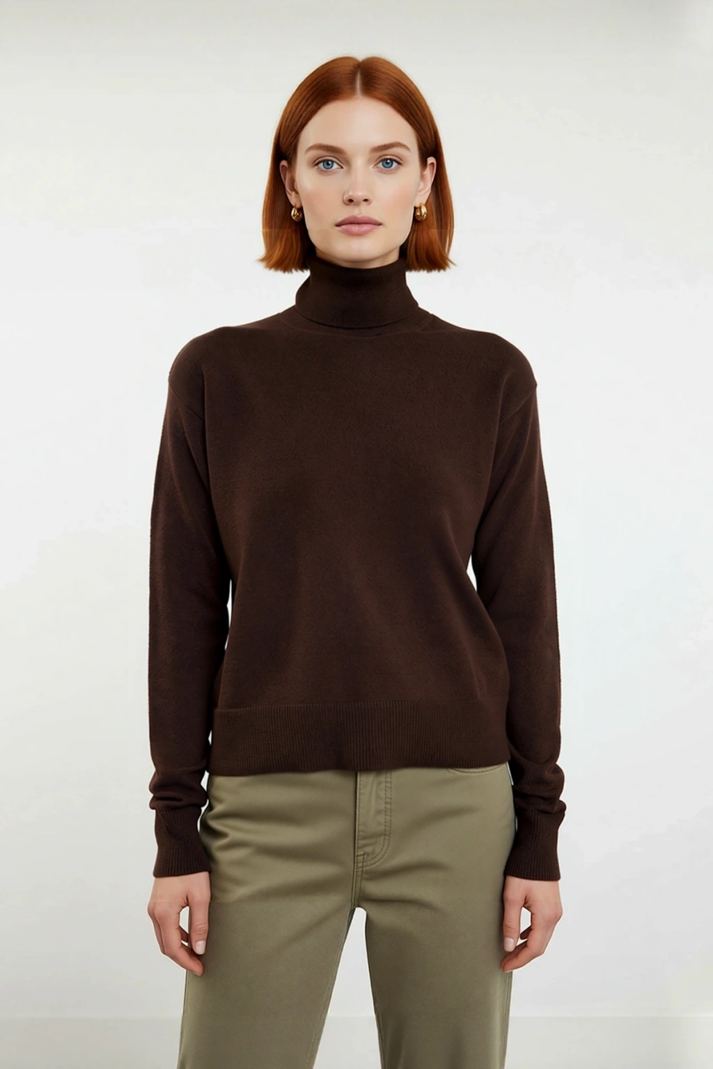 Ürün Özellikleri: Regular kalıp, yünlü materyal, düz desen, balıkçı yaka, standart kol, triko kumaş, kahverengi renk, baskısız tasarım, cepsiz.