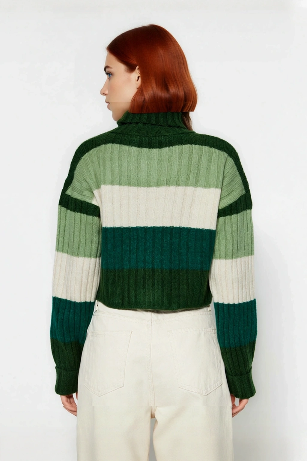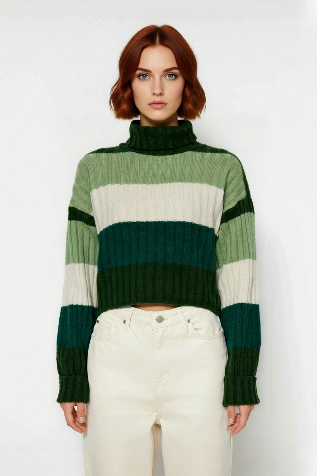 Ürün Özellikleri: Regular kalıp, akrilik polyester materyal, renk bloklu desen, balıkçı yaka, uzun düşük kol, fitilli triko kumaş, yeşil renk.