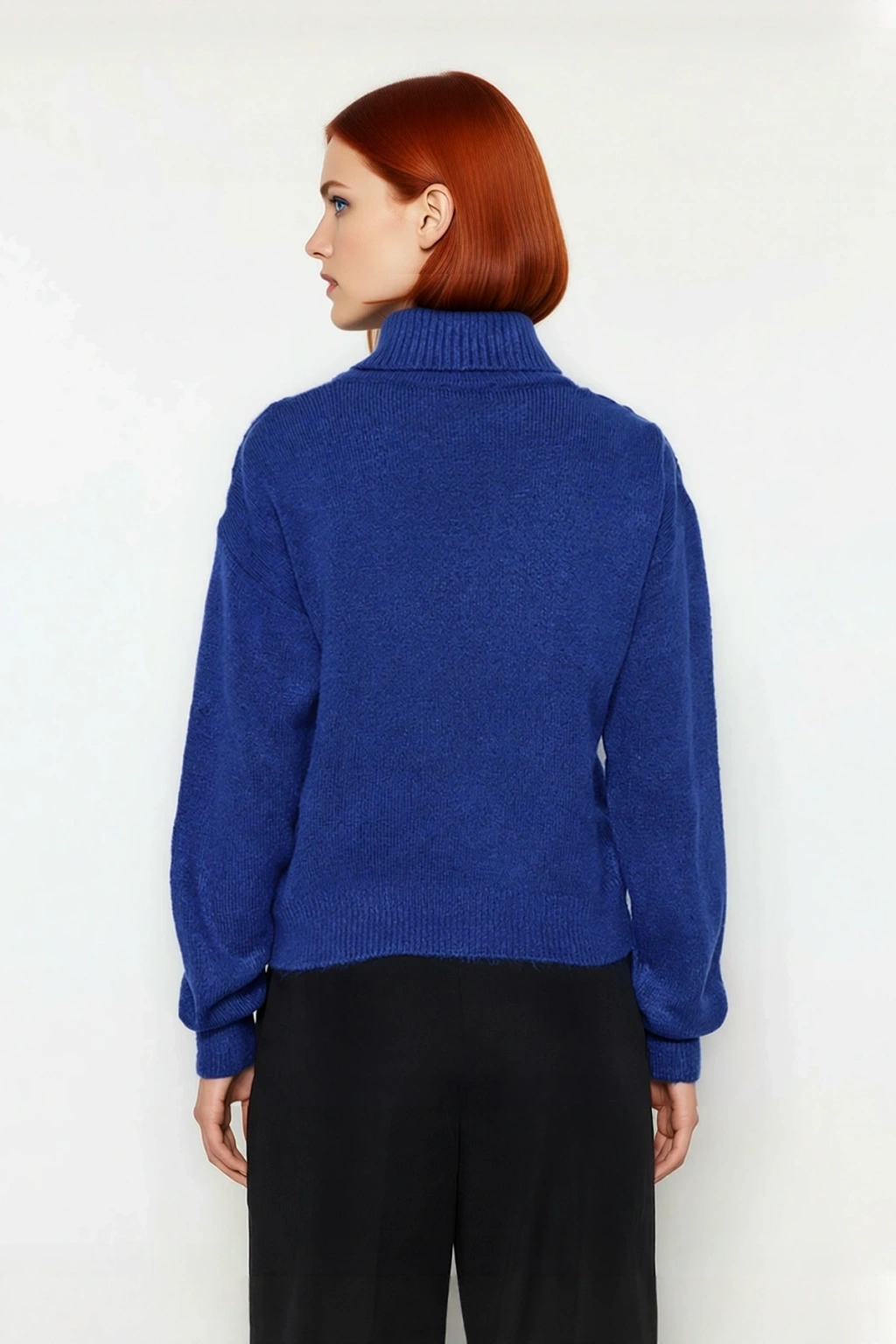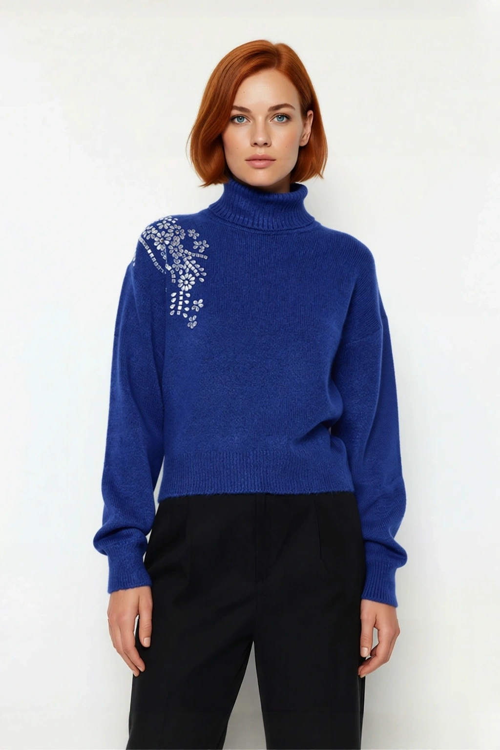 Ürün Özellikleri: Regular kalıp, akrilik polyester materyal, taş işlemeli desen, balıkçı yaka, standart kol, triko kumaş, lacivert renk.