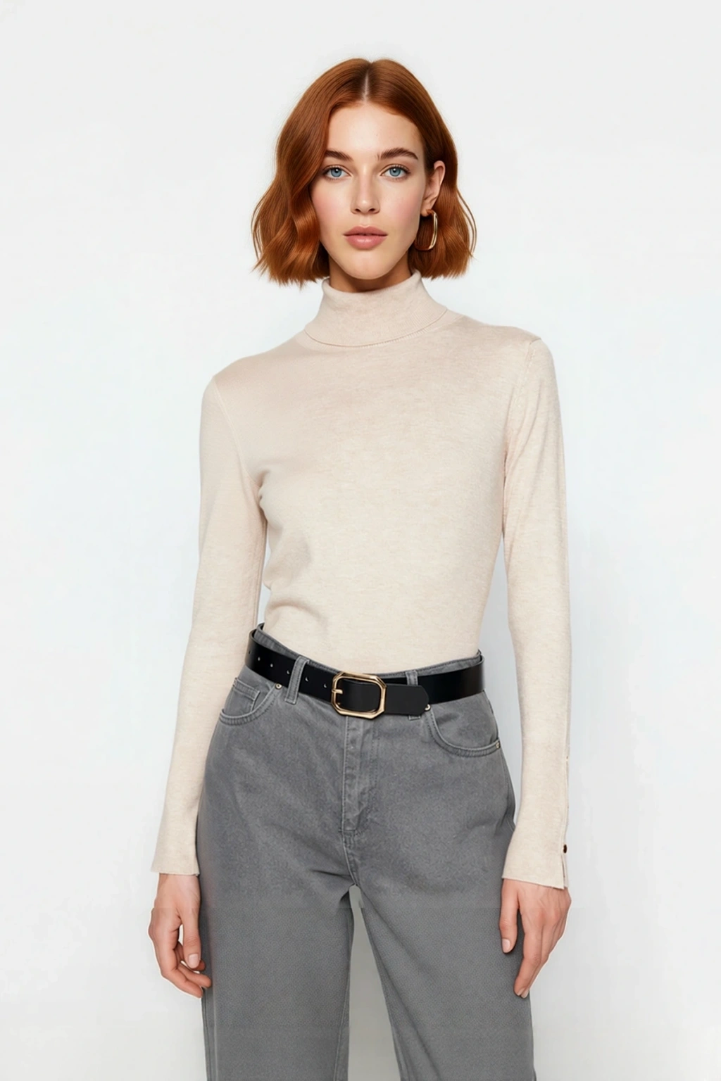 Ürün Özellikleri: Fitted kalıp, viskoz polyester poliamid materyal, düz desen, balıkçı yaka, standart kol, triko kumaş, ekru renk.