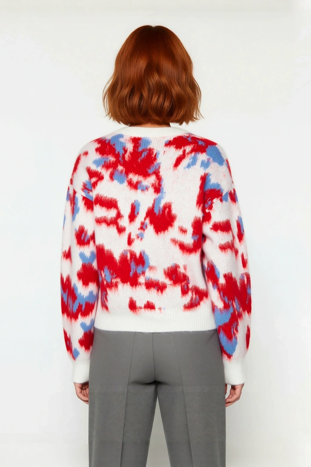 Bu Kadın Basic Bisiklet Yaka Oversize Kalıp Batik Desenli Triko Kazak, kışlık konforu ve modern tasarımı bir araya getiriyor. Oversize kalıbı sayesinde rahat ve salaş bir duruş sergilerken, akrilik materyali yumuşak dokusuyla cildinize konfor sunar ve soğuk havalarda sıcak tutar. Ekru zemin üzerindeki canlı kırmızı ve mavi batik deseni, kazaka enerjik ve özgün bir karakter katarken, cepsiz tasarımıyla sade bir şıklık yakalamanızı sağlar. Bu kazak, casual şıklığı ve fonksiyonelliği bir arada arayan kadınlar için mükemmel bir seçenektir.