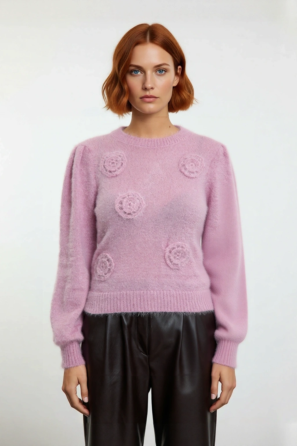 Bu Kadın Basic Pembe Triko Kazak, regular kalıbıyla her vücut tipine mükemmel uyum sağlarken, zarif ve rahat bir görünüm sunar. Yüksek kaliteli %100 polyester materyali sayesinde cilde yumuşacık bir dokunuş hissi verir ve kış aylarının soğuk günlerinde ideal sıcaklığı korur. Üzerindeki nakışlı ve işlemeli çiçek desenleri, kazaya feminen ve şık bir hava katarken, canlı pembe rengi ile enerjik ve pozitif bir stil yaratır. Bu özel tasarım, soğuk havalarda bile tarzınızdan ödün vermek istemeyen modern kadınlar için kusursuz bir seçimdir. Kendinizi gün boyu özel ve konforlu hissetmenizi sağlayacak bu kazak, günlük şıklığınızın vazgeçilmezi olmaya adaydır.