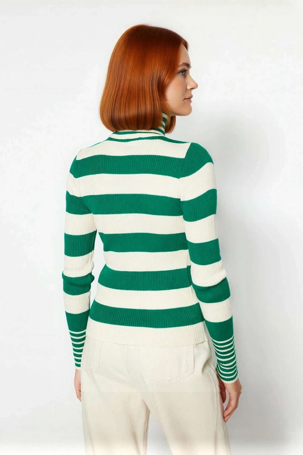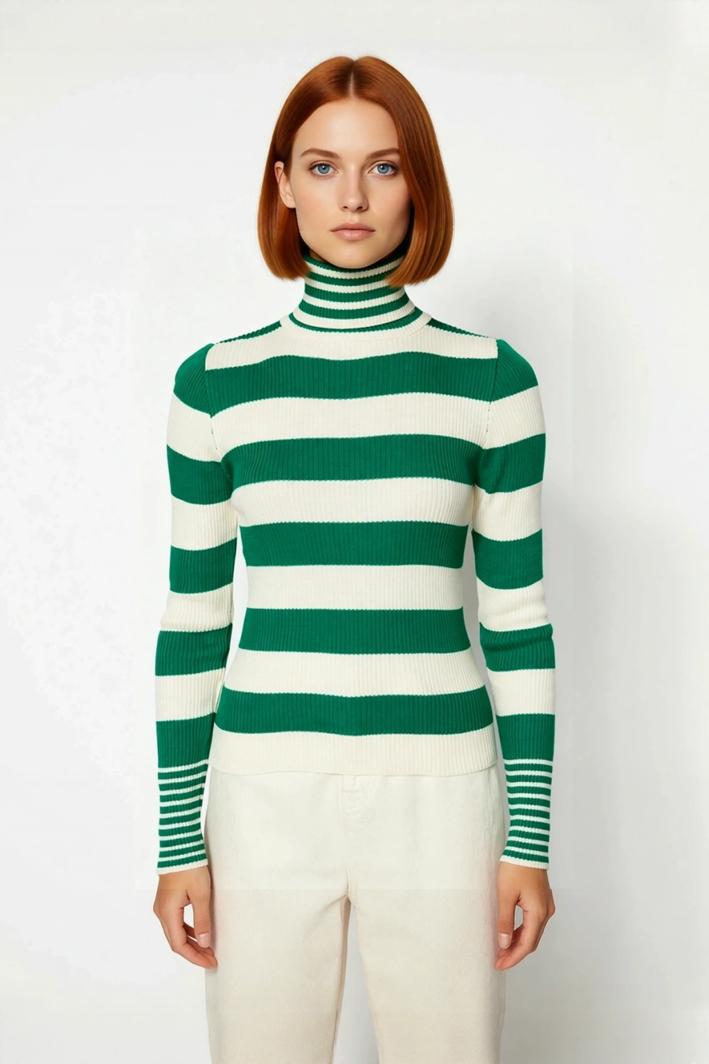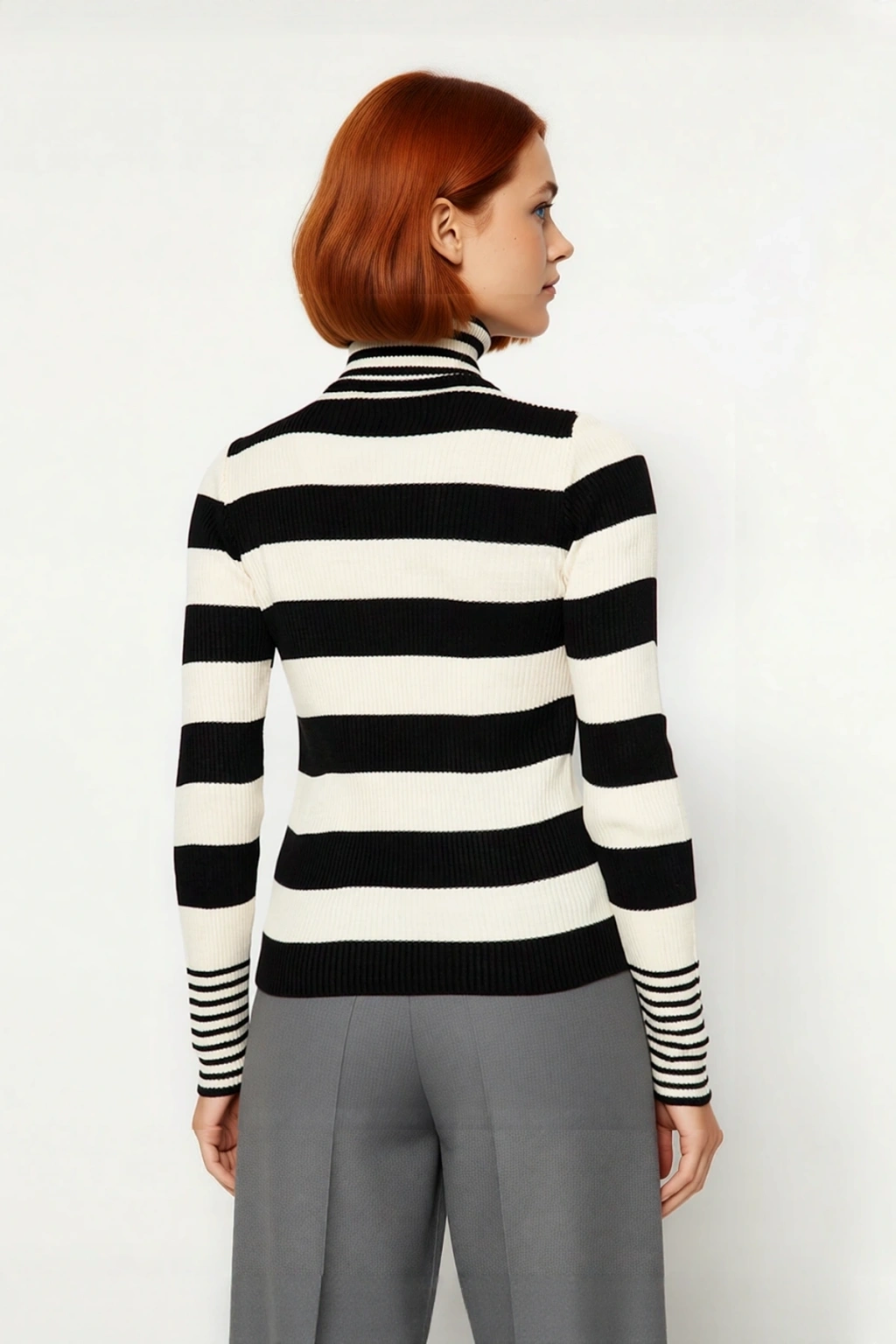 Ürün Özellikleri: Regular kalıp, %100 akrilik materyal, çizgili desen, balıkçı yaka, standart kol, triko kumaş, siyah-ekru renk, cepsiz tasarım.
