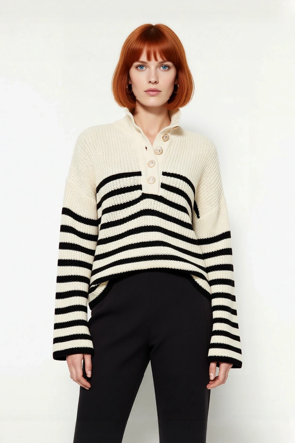 Ürün Özellikleri: Oversize kalıp, 100% akrilik materyal, çizgili desen, dik yaka, düşük kol, triko kumaş, ekru renk, baskısız tasarım.