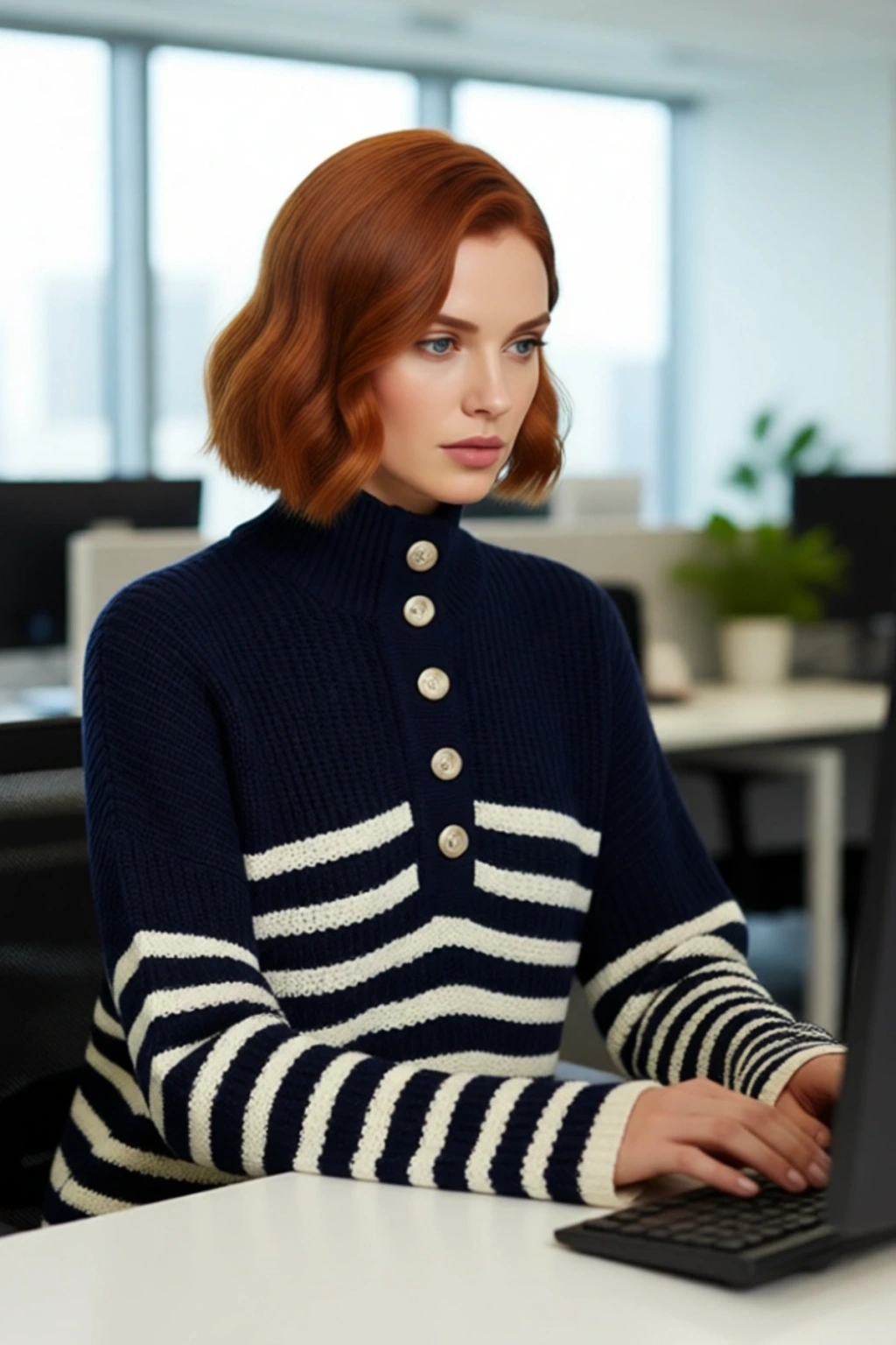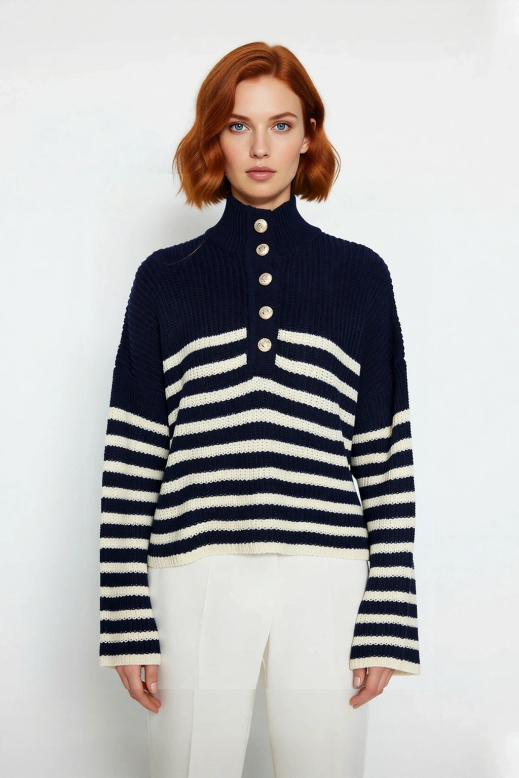 Bu kazak, boynu saran dik yaka tipiyle soğuğa karşı ekstra koruma sağlarken, ön kısmındaki zarif düğmelerle estetik bir detay katar. Düşük kol tasarımı ve uzun kol boyu, rahat bir kullanım sunar ve modern bir siluet oluşturur. Kaliteli triko kumaşı, orta kalınlığı sayesinde nefes alabilir bir yapıya sahip olup, gün boyu konforlu bir his bırakır. Cepsiz ve kemersiz yapısı, minimalist bir duruş sergilerken, tek plaka dokuma tekniği sayesinde ürünün dayanıklılığı artırılmıştır. Bakım kolaylığı sunan makinede yıkanabilirlik özelliği, bu kazağı pratik bir giyim alternatifi yapar ve kullanım ömrünü uzatır.