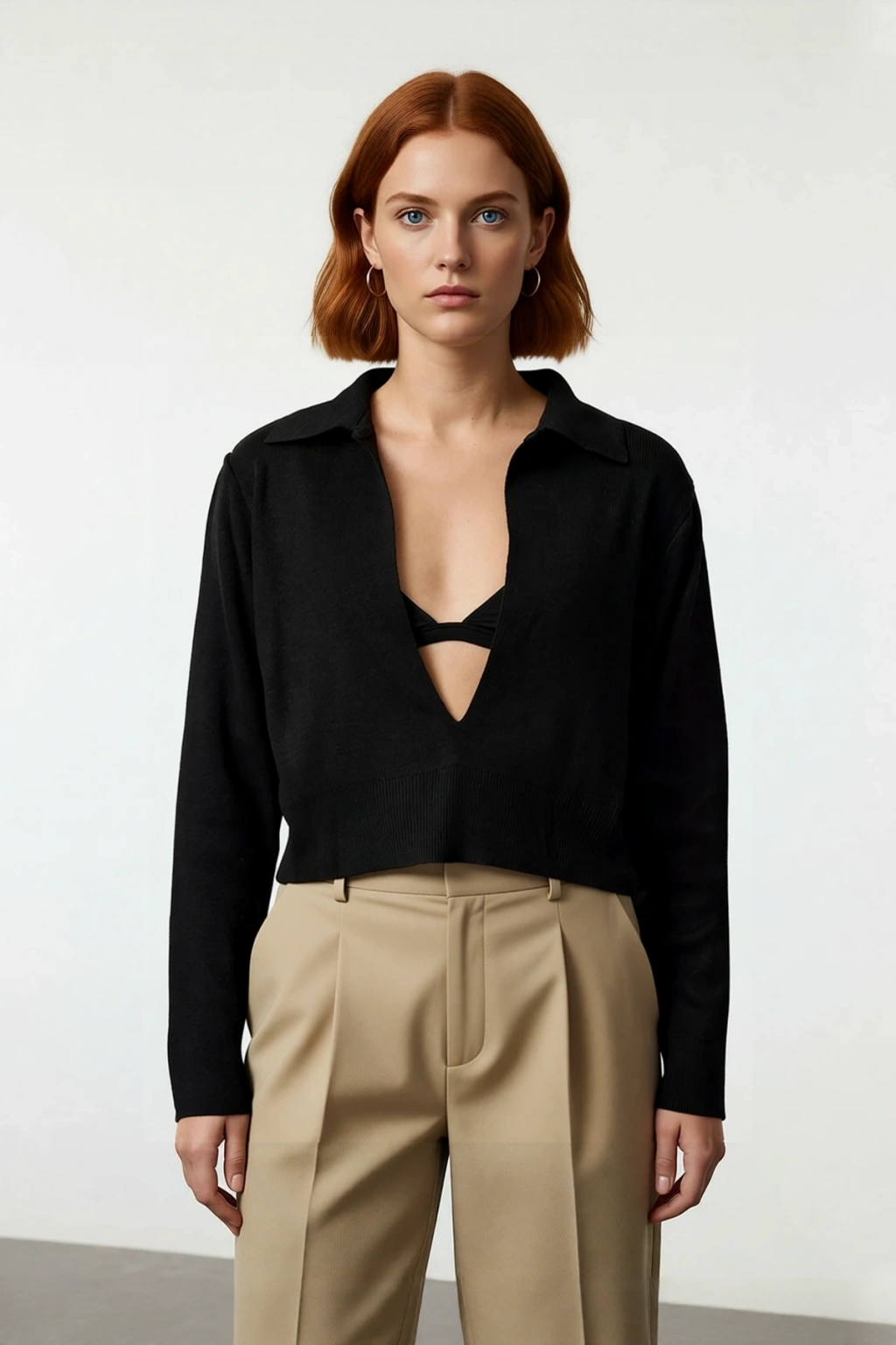 Ürün Özellikleri: Regular kalıp, akrilik materyal, düz desen, polo yaka, standart kol, triko kumaş, siyah renk.