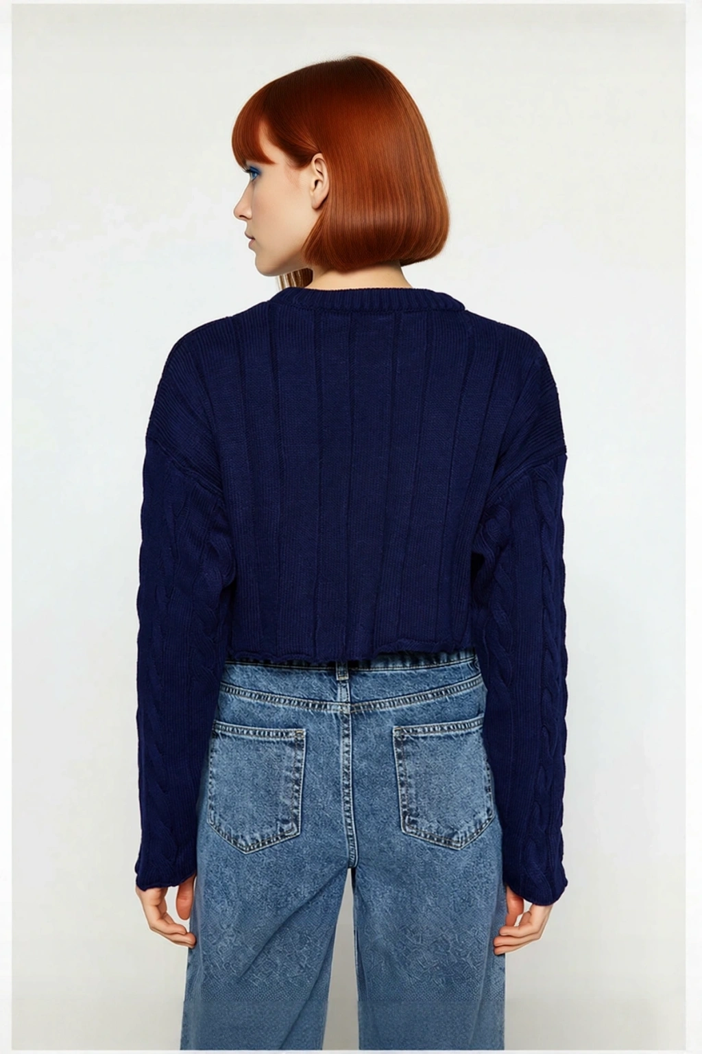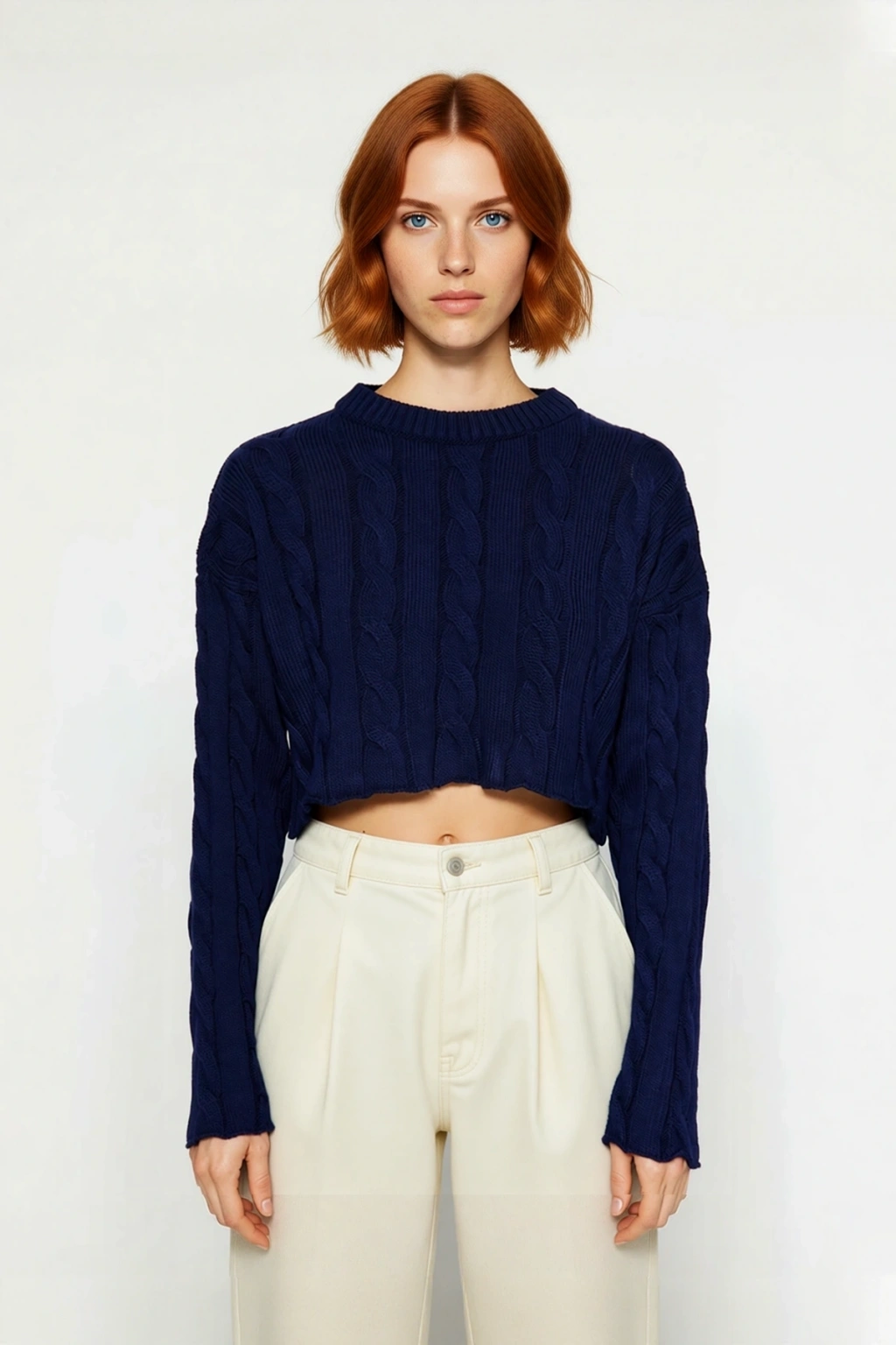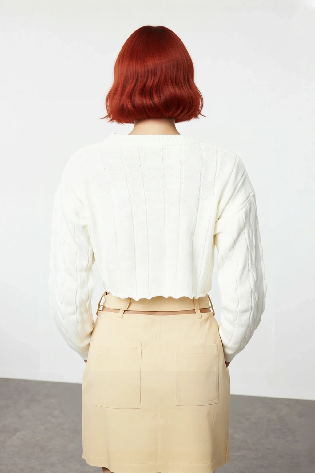 Ürün Özellikleri: Regular kalıp, %100 akrilik materyal, saç örgü desen, bisiklet yaka, standart uzun kol, triko kumaş, ekru renk, süper crop boy.