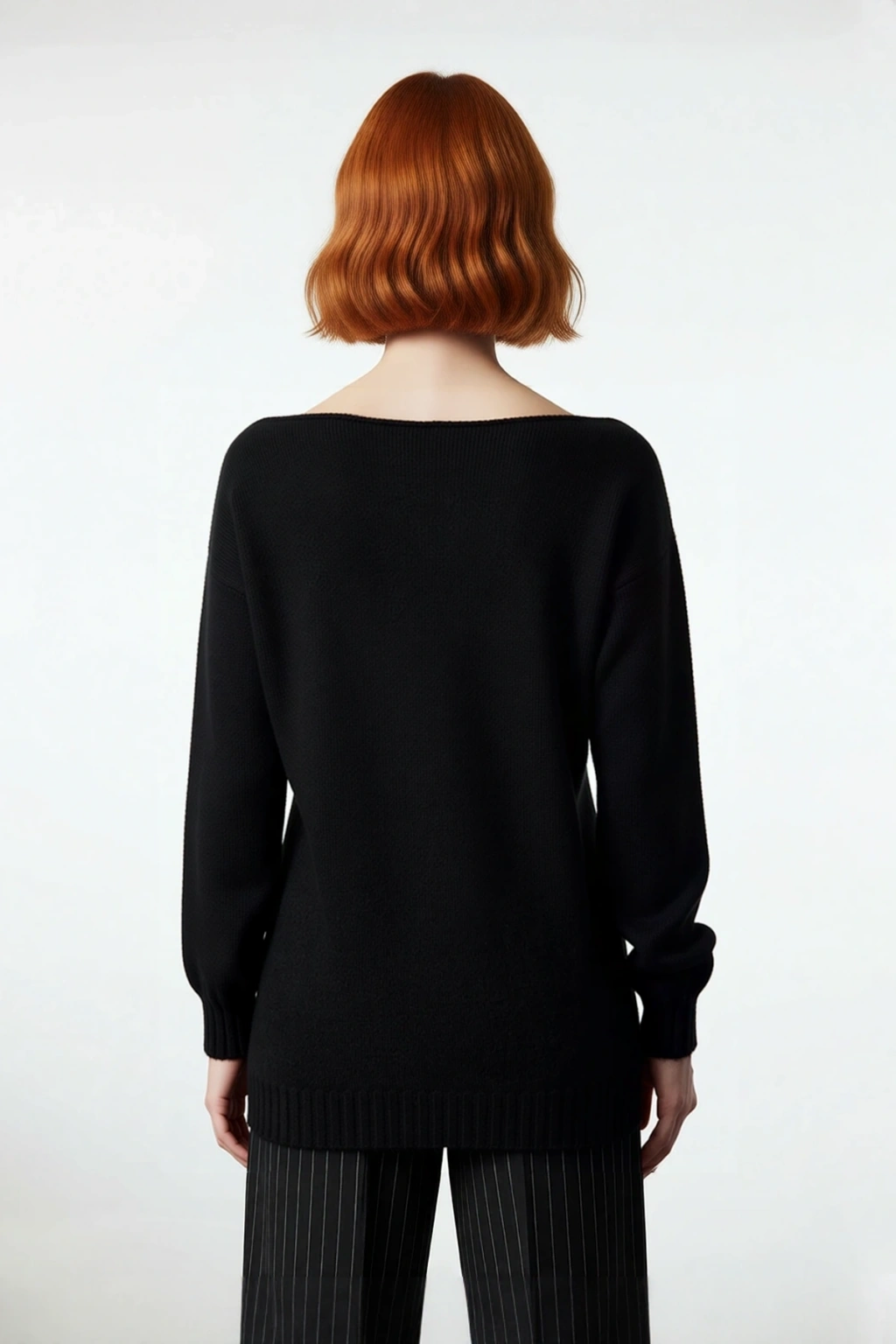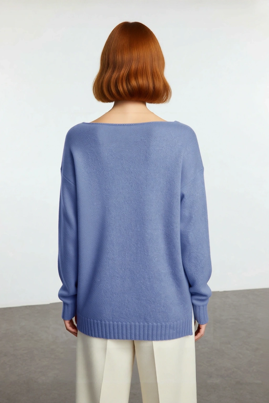 Ürün Özellikleri: Oversize kalıp, akrilik polyester yün materyal, düz desen, kayık yaka, standart kol, triko kumaş, lacivert renk, ince kalınlık.