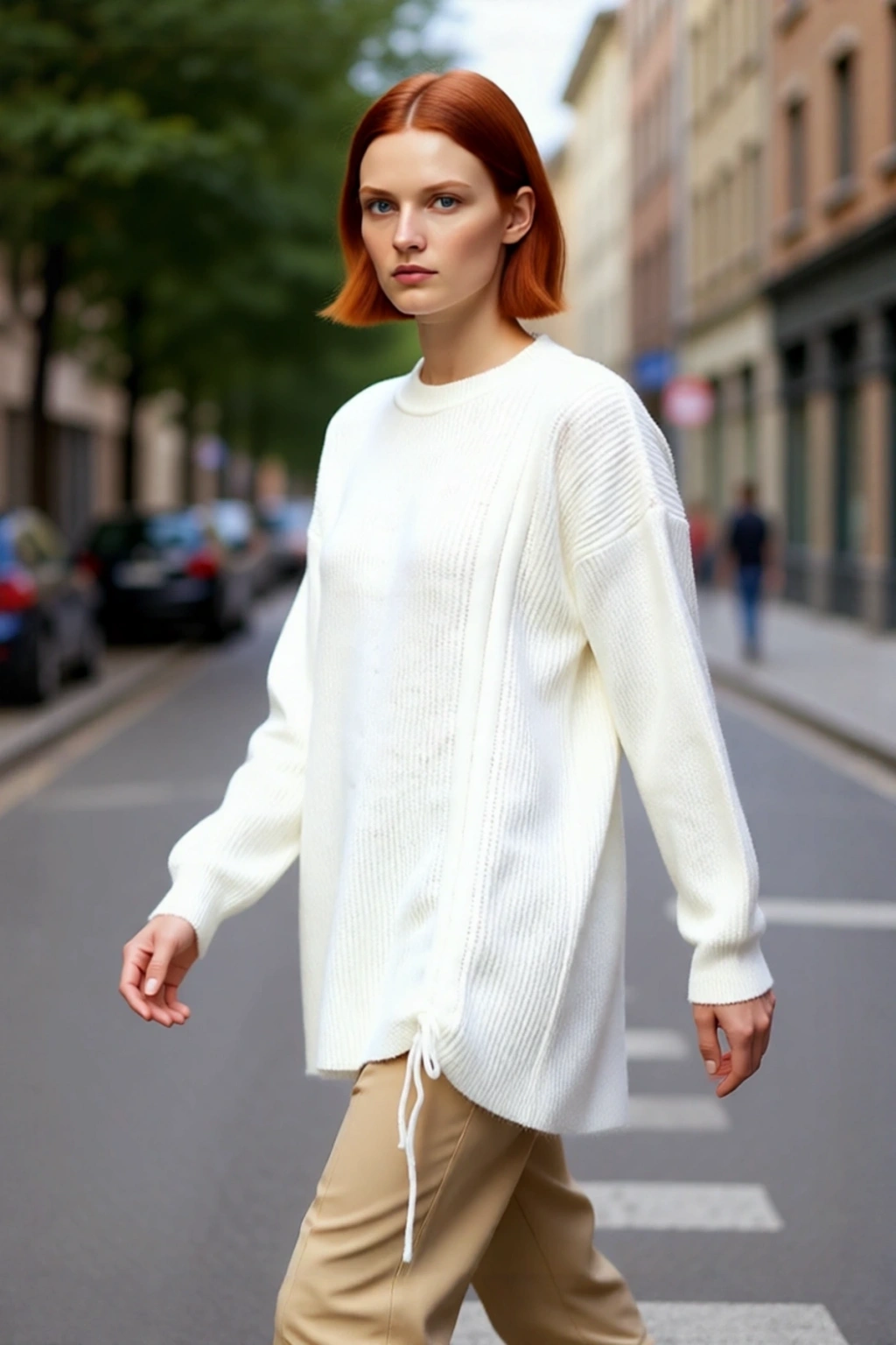 Ürün Özellikleri: Relaxed kalıp, akrilik polyester materyal, düz desen, bisiklet yaka, düşük kol, triko kumaş, ekru renk.