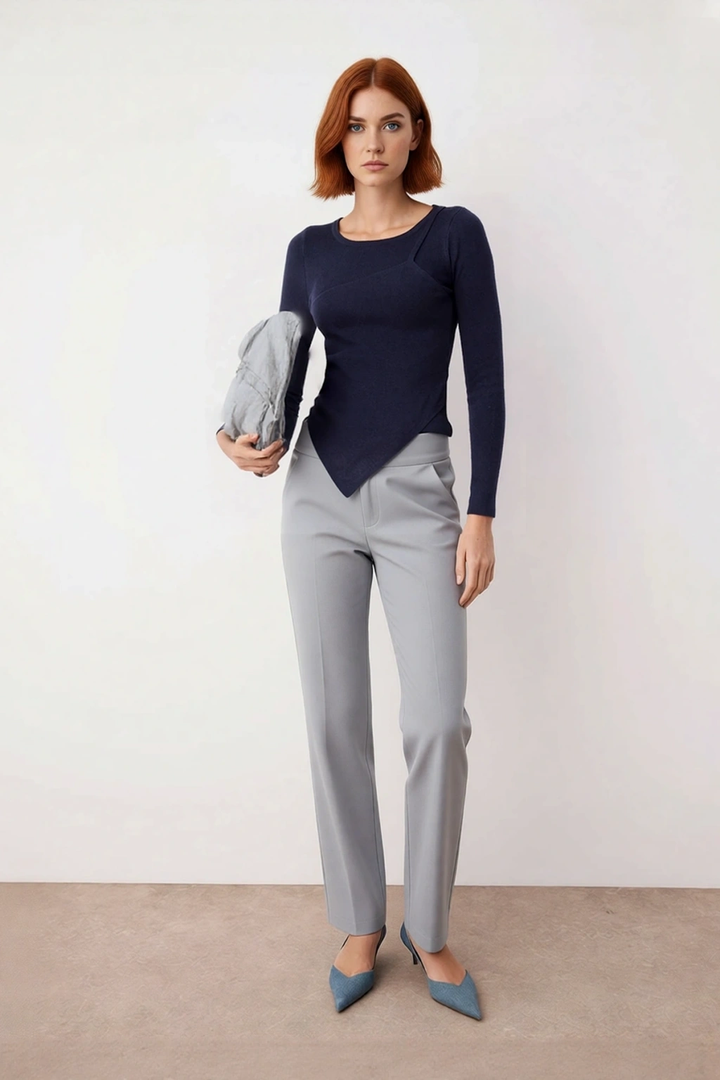 Bu lacivert kadın triko kazak, fitted kalıbı ile vücuda nazikçe oturarak modern ve şık bir görünüm sunar. Viskoz, polyester ve poliamid karışımı ile hazırlanan özel materyal bileşimi sayesinde, teninize ipeksi bir dokunuş hissi verirken aynı zamanda gün boyu rahatlık sağlar. Düz deseni minimalist ve sofistike bir estetik yaratırken, derin lacivert tonu her kombini kolayca tamamlar. Ürünün iç içe geçmiş gibi duran asimetrik yaka ve etek ucu detayı, basic siluetine dinamik bir dokunuş katarken, ilkbahar ve sonbahar aylarının serin günleri için ideal bir seçenektir.