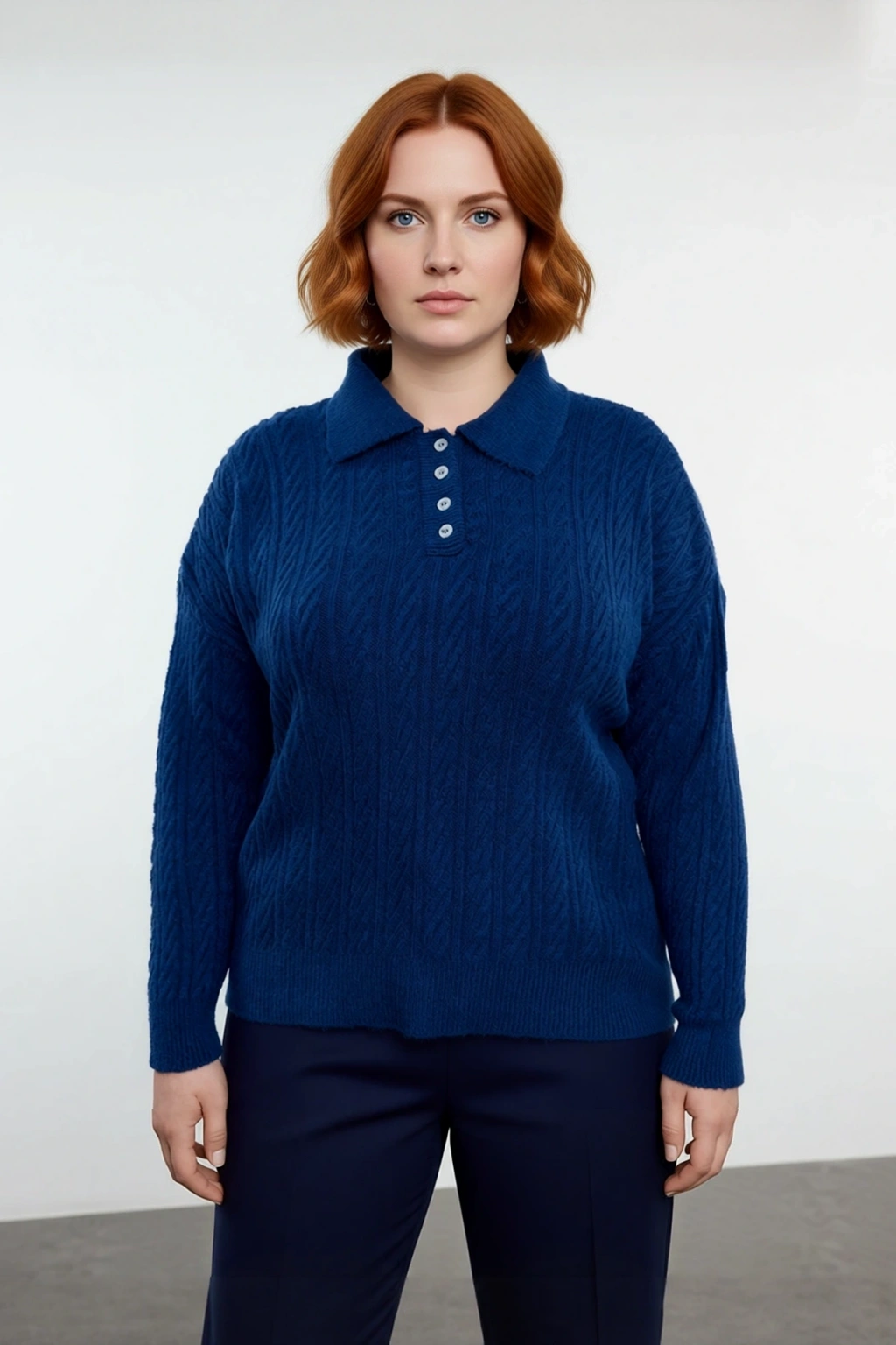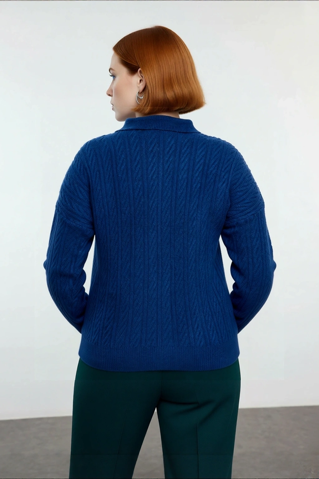 Ürün Özellikleri: Regular kalıp, akrilik materyal, saç örgü desen, polo yaka, düşük kol, triko kumaş, mavi renk.