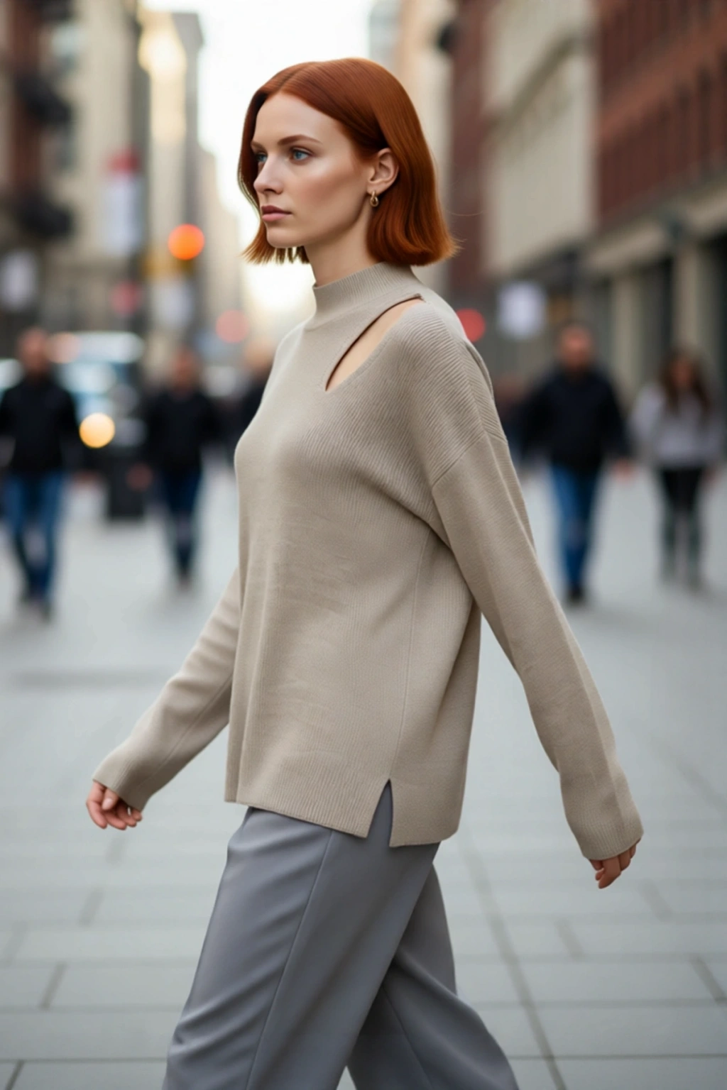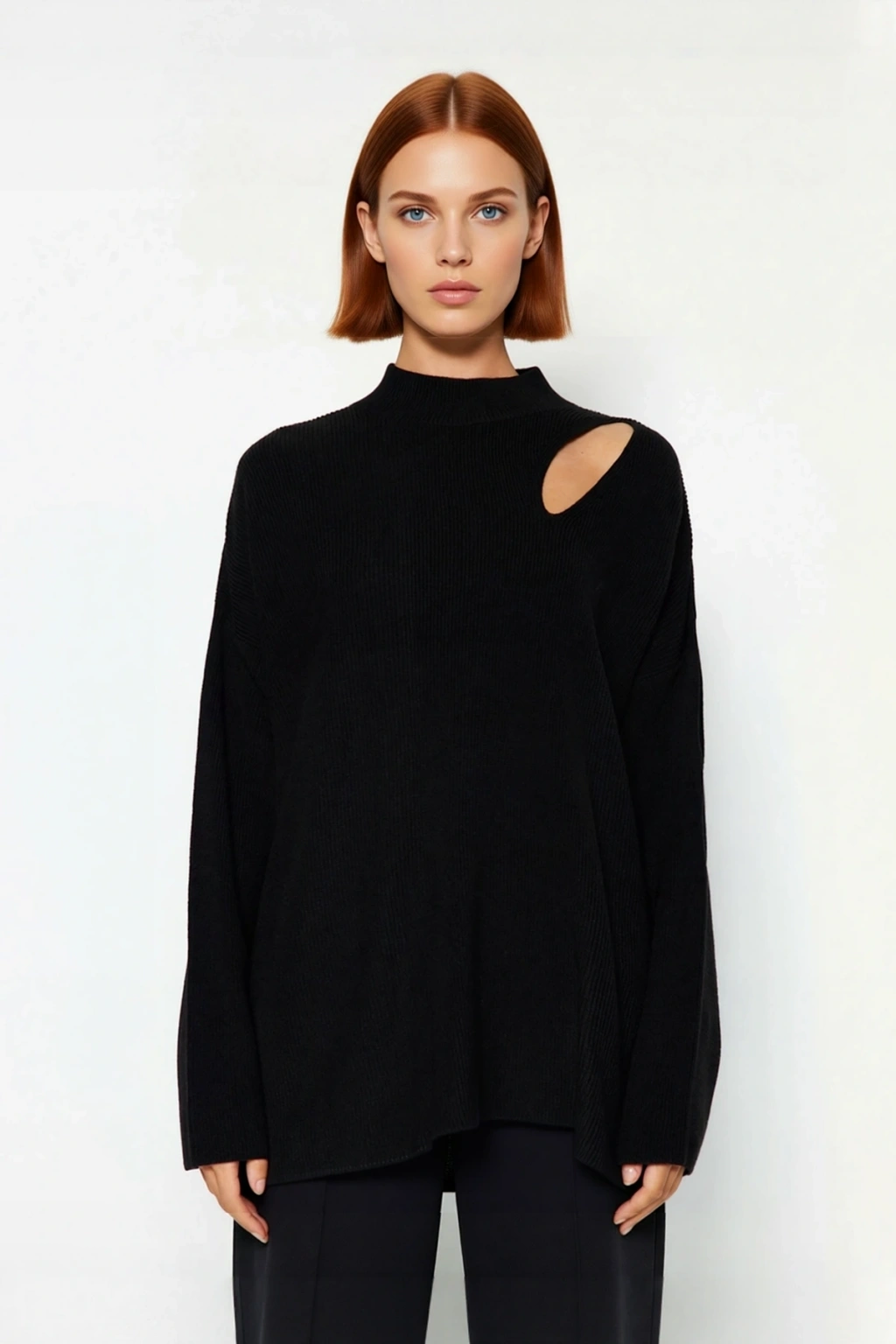 Bu kadın oversize triko kazak, omuz kısmındaki cut out detayıyla geleneksel kazaklara modern ve cesur bir alternatif sunuyor. %100 akrilik materyalden üretilen bu parça, kış aylarının vazgeçilmezi olacak yumuşaklık ve sıcaklık sunar. Siyah rengi, düz deseni ve baskısız tasarımıyla her türlü kombininize kolayca adapte olurken, fitilli dokuma özelliği kazaka benzersiz bir dokusal derinlik katıyor. Bu basic siluet, zahmetsiz şıklığın anahtarıdır.