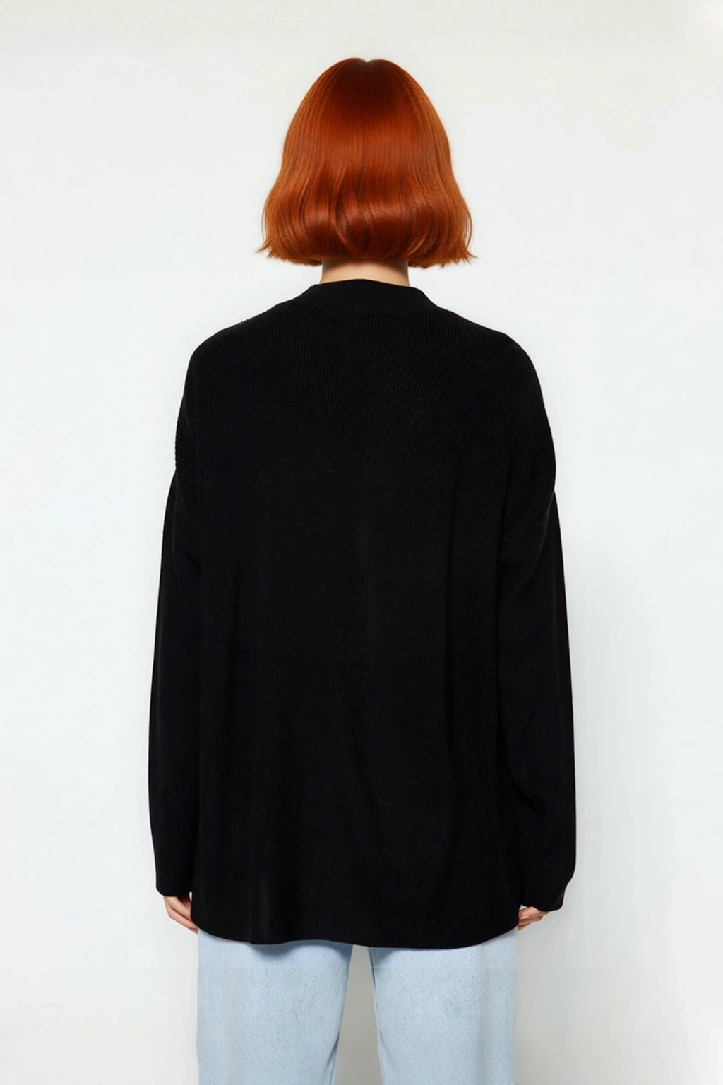 Ürün Özellikleri: Oversize kalıp, %100 akrilik materyal, düz desen, bisiklet yaka, düşük kol, triko kumaş, siyah renk, baskısız tasarım.