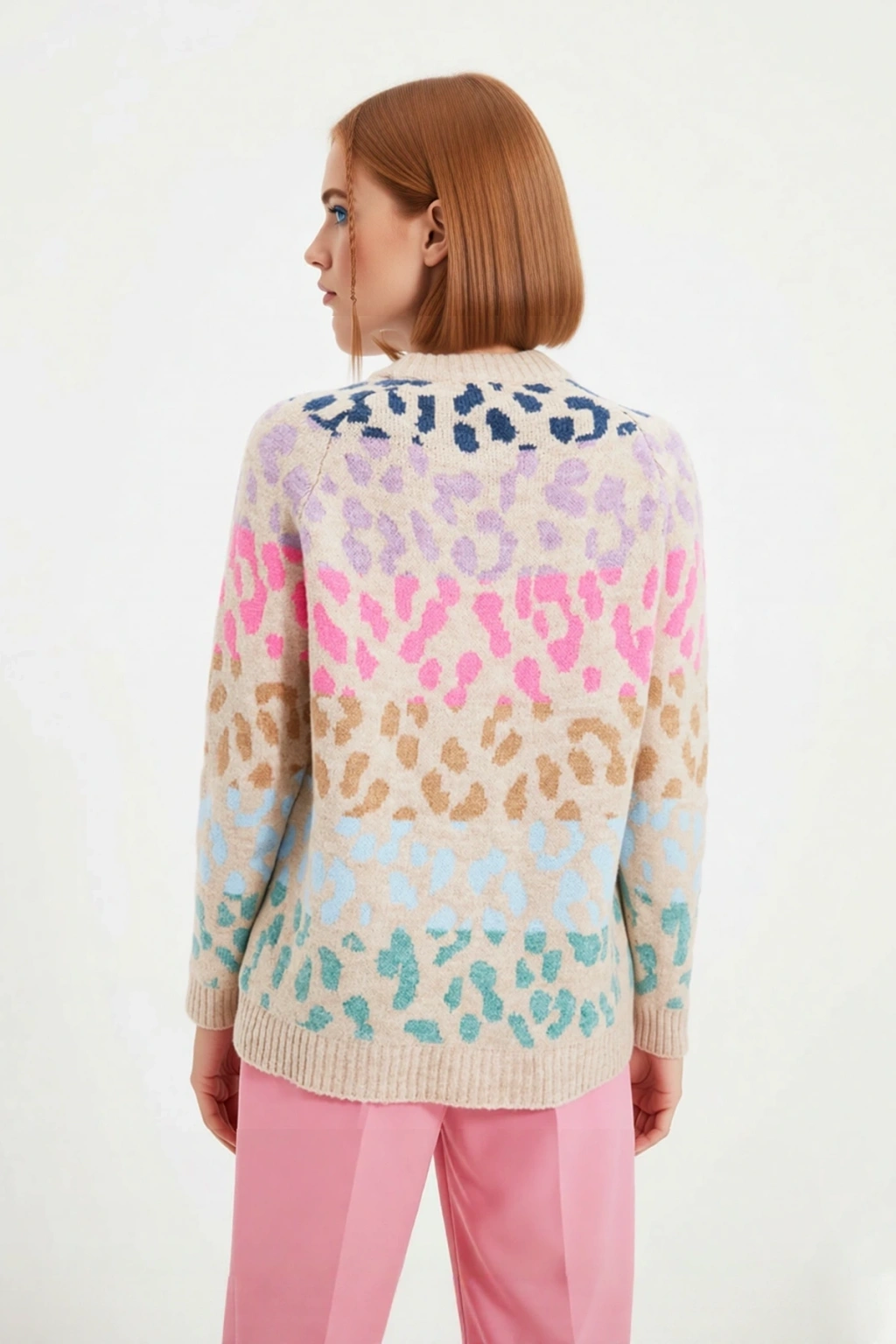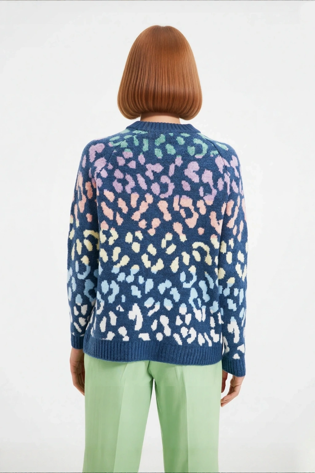 Ürün Özellikleri: Oversize kalıp, %73 Akrilik %27 Polyester materyal, Animal desen, Bisiklet yaka, Reglan kol, Triko kumaş, Lacivert renk, Cepsiz tasarım.