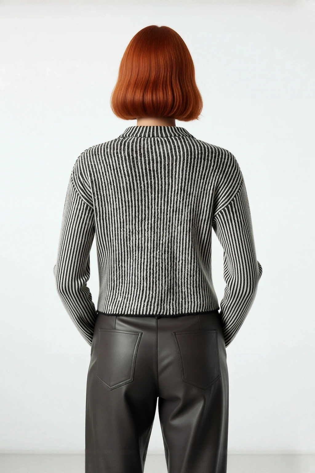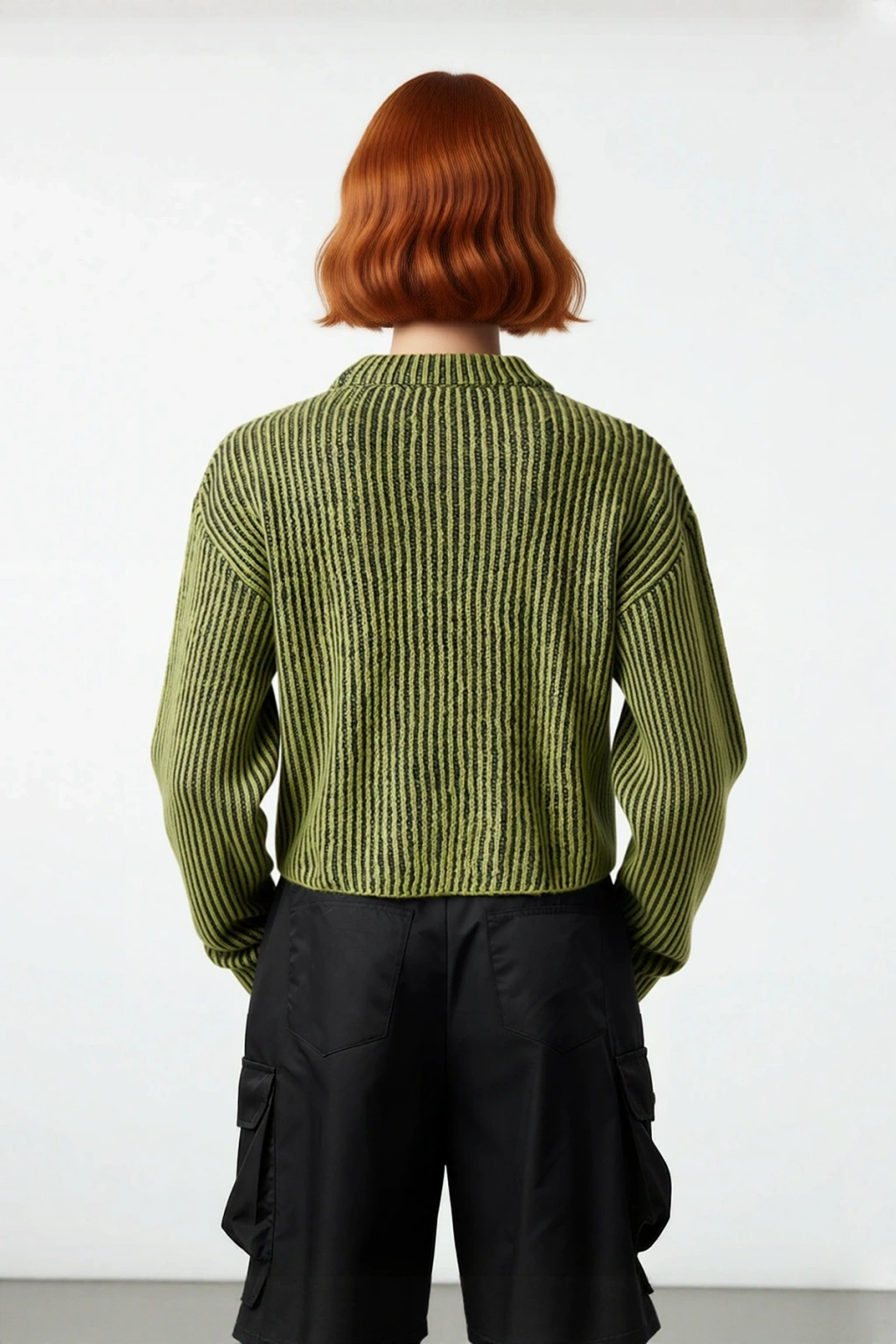 Ürün Özellikleri: Regular kalıp, 78% Akrilik 22% Polyester materyal, çizgili desen, dik yaka, standart kol, triko kumaş, yeşil ve siyah çizgili renk.