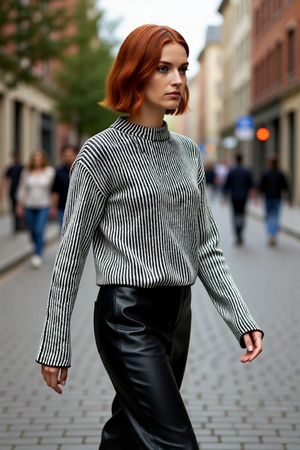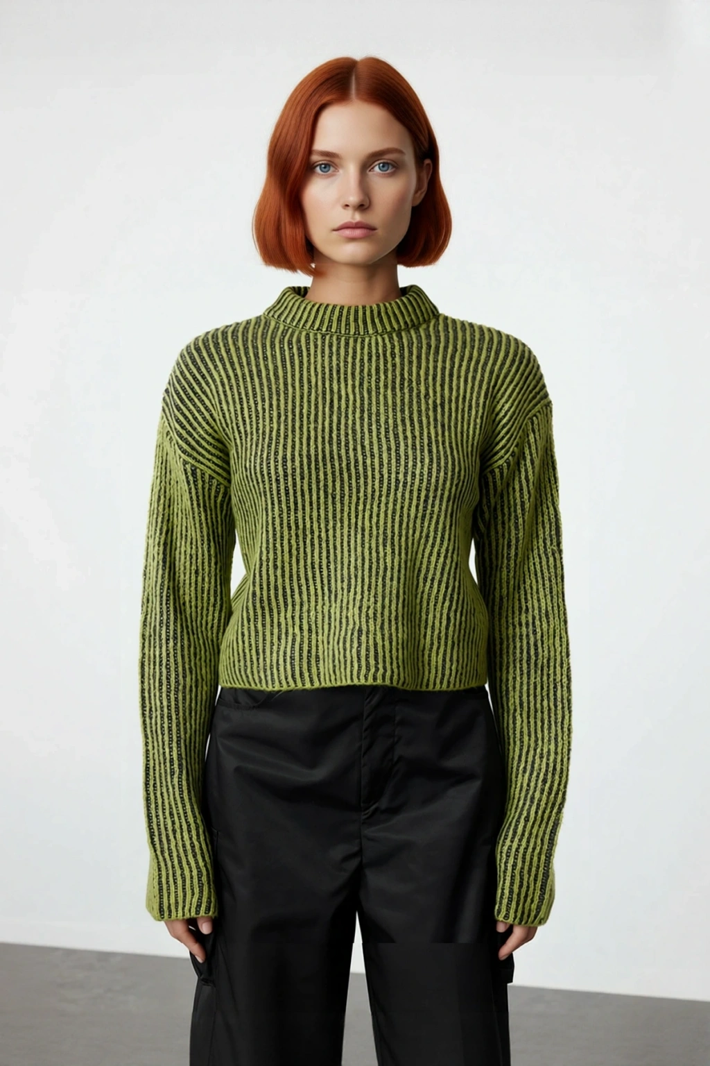 Modern ve enerjik bir görünüme sahip bu kadın crop triko kazak, regular kalıbıyla üzerinizde rahatça durur. %78 akrilik ve %22 polyesterin eşsiz karışımı sayesinde, soğuk havalarda üstün sıcaklık ve yumuşak bir his sunar. Yeşil ve siyah çizgili deseni, kazağa çağdaş bir dokunuş katarken, dik yaka tasarımı boynunuzu sararak hem sıcaklık hem de zarif bir stil sağlar. Bu parça, günlük yaşamınızda Cool & Comfort hissini arayanlar için mükemmel bir seçimdir.