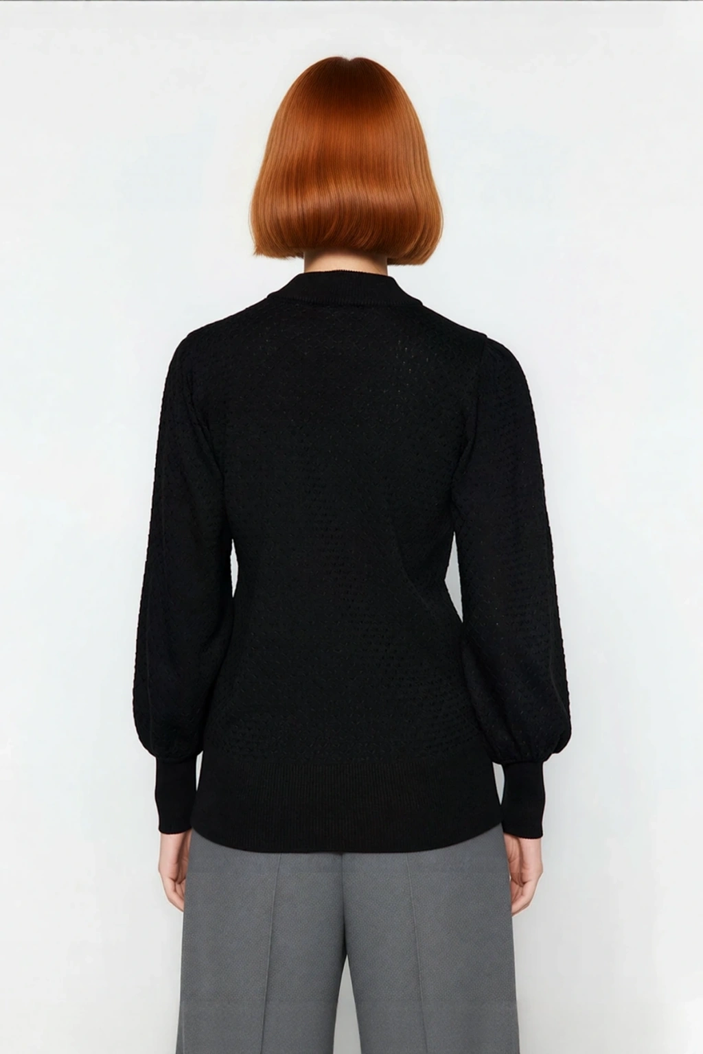 Ürün Özellikleri: Regular kalıp, akrilik materyal, dokulu desen, dik yaka, balon kol, triko kumaş, ekru renk.