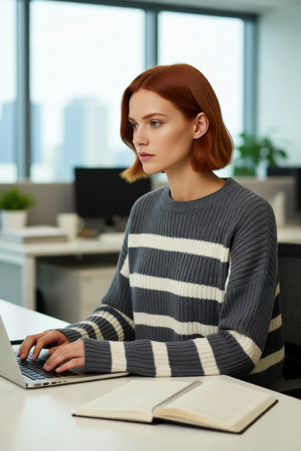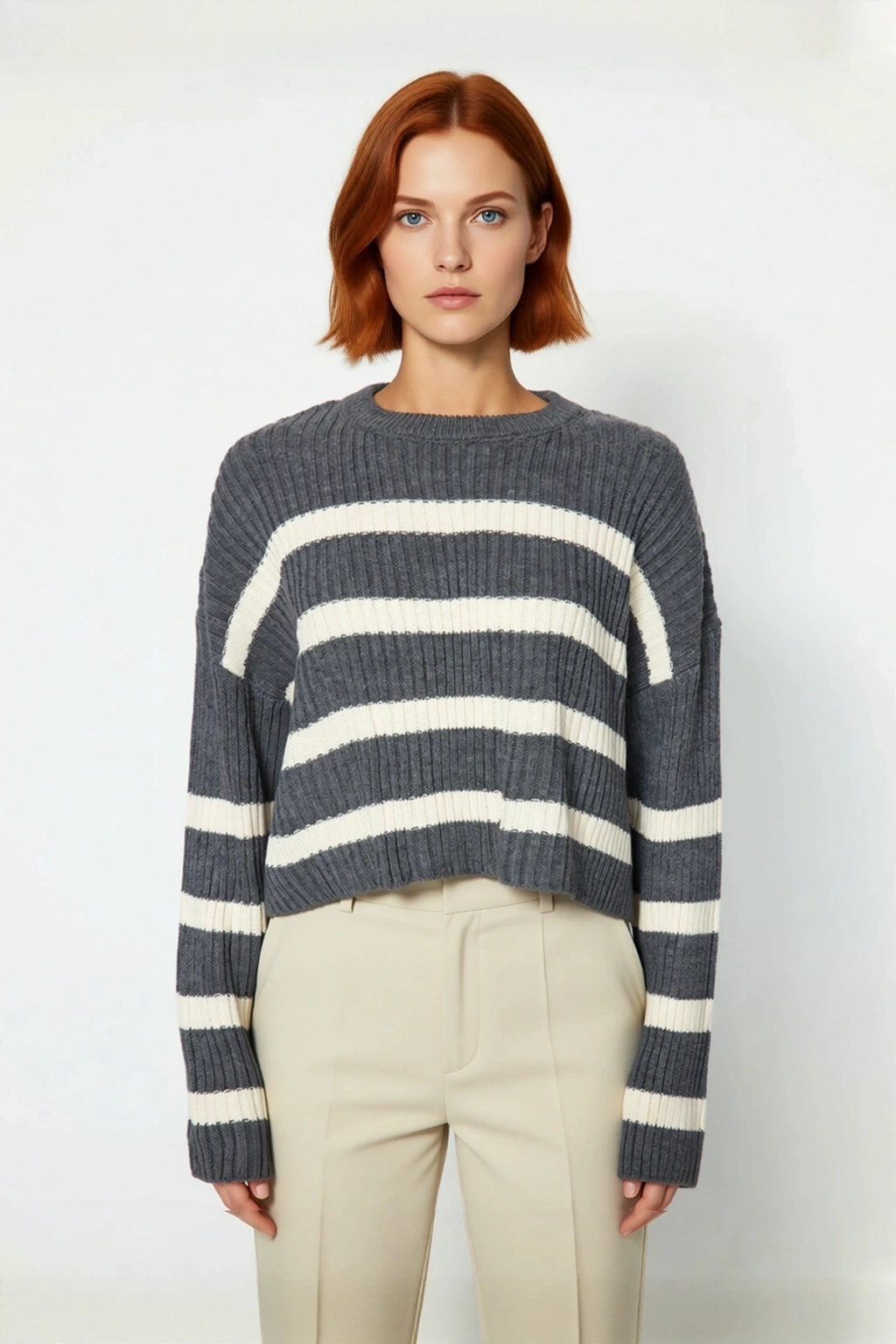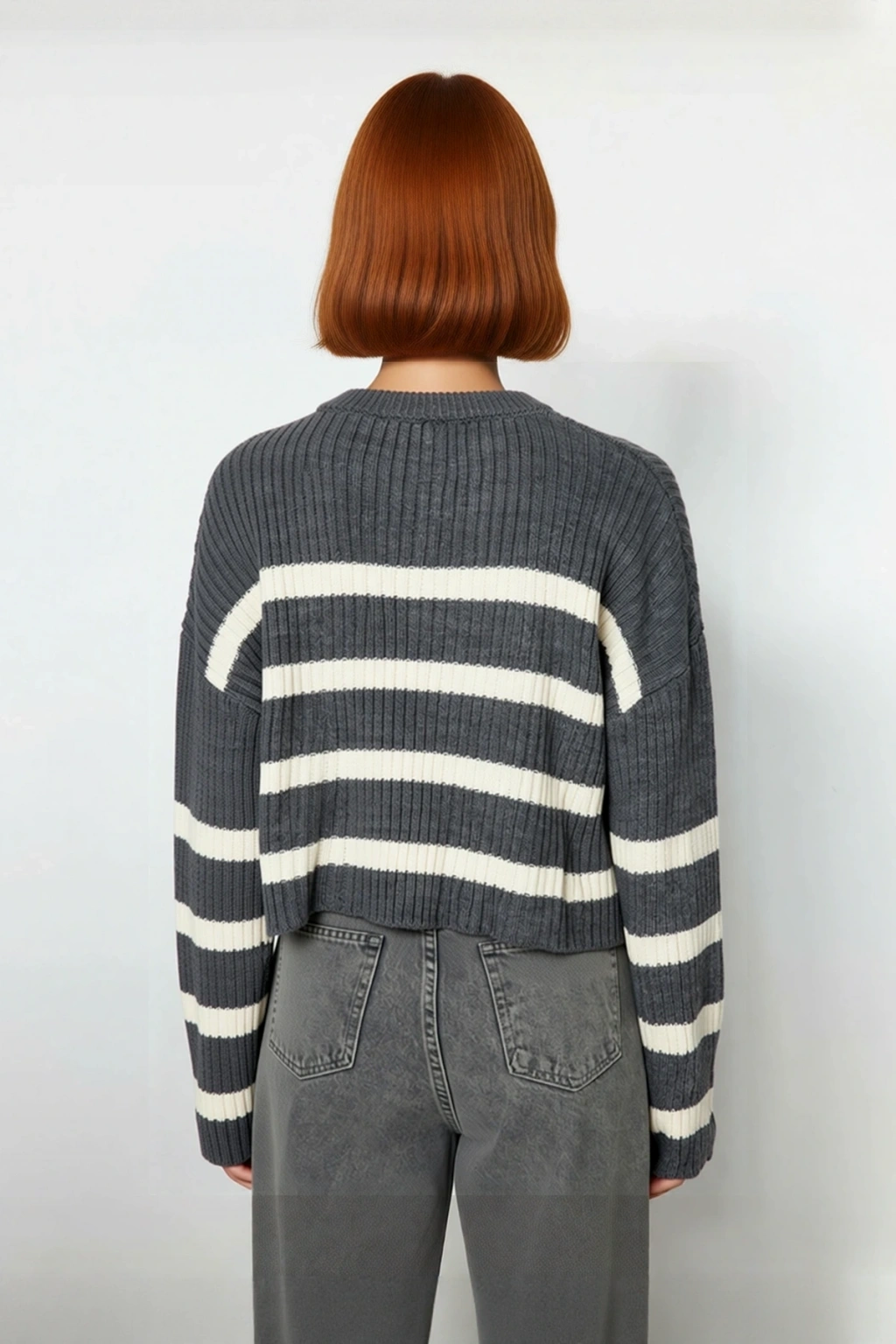 Ürün Özellikleri: Oversize kalıp, akrilik materyal, çizgili desen, bisiklet yaka, düşük kol, triko kumaş, gri renk.