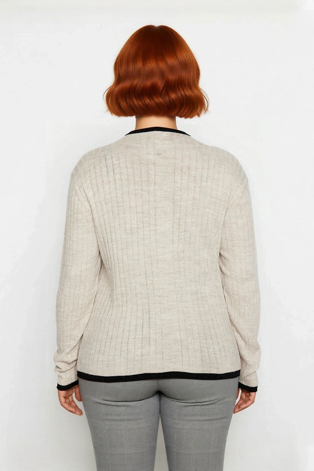 Kadın giyiminde basic siluetin zamansız şıklığını yansıtan bu ince akrilik triko kazak, her kadının gardırobunda olması gereken bir parçadır. Fitted kalıbı, vücuda nazikçe oturarak zarif bir duruş sergilerken, yüksek kaliteli akrilik materyali sayesinde son derece yumuşak ve hafiftir. Fitilli dokuma yapısı, düz desenin sade güzelliğini modern bir twist ile birleştirir. Bej rengi, her türlü alt giyimle kolayca uyum sağlarken, yaka ve kol uçlarındaki siyah detaylar kazaka karakteristik bir hava katar. Bu kazak, günlük kullanımda rahatlık ve stil arayanlar için idealdir.