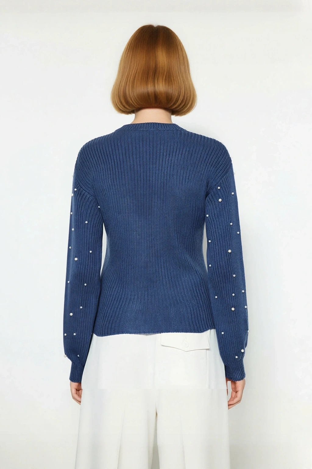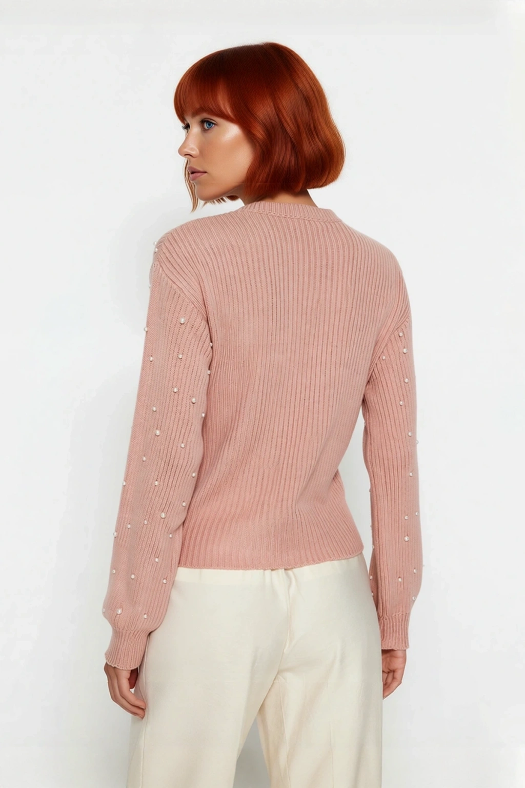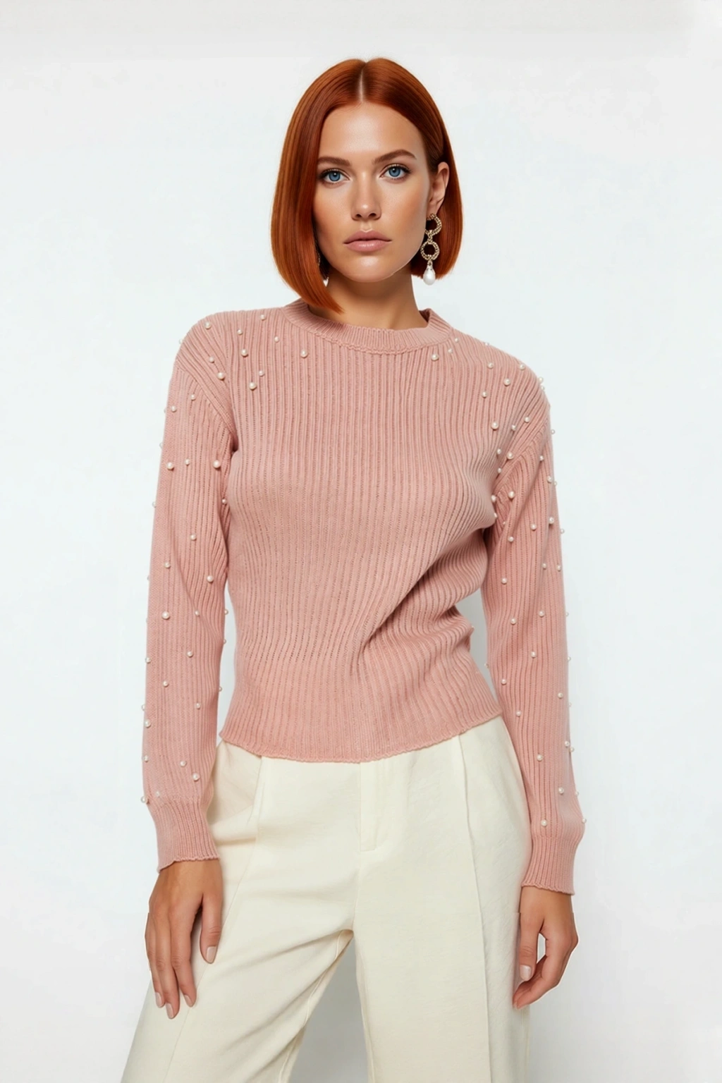 Ürün Özellikleri: Regular kalıp, akrilik materyal, inci detaylı desen, bisiklet yaka, düşük kol, triko kumaş, ekru renk, cepsiz tasarım.