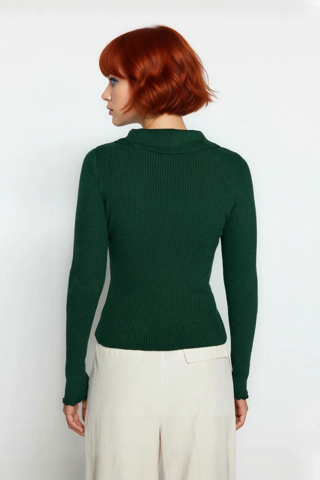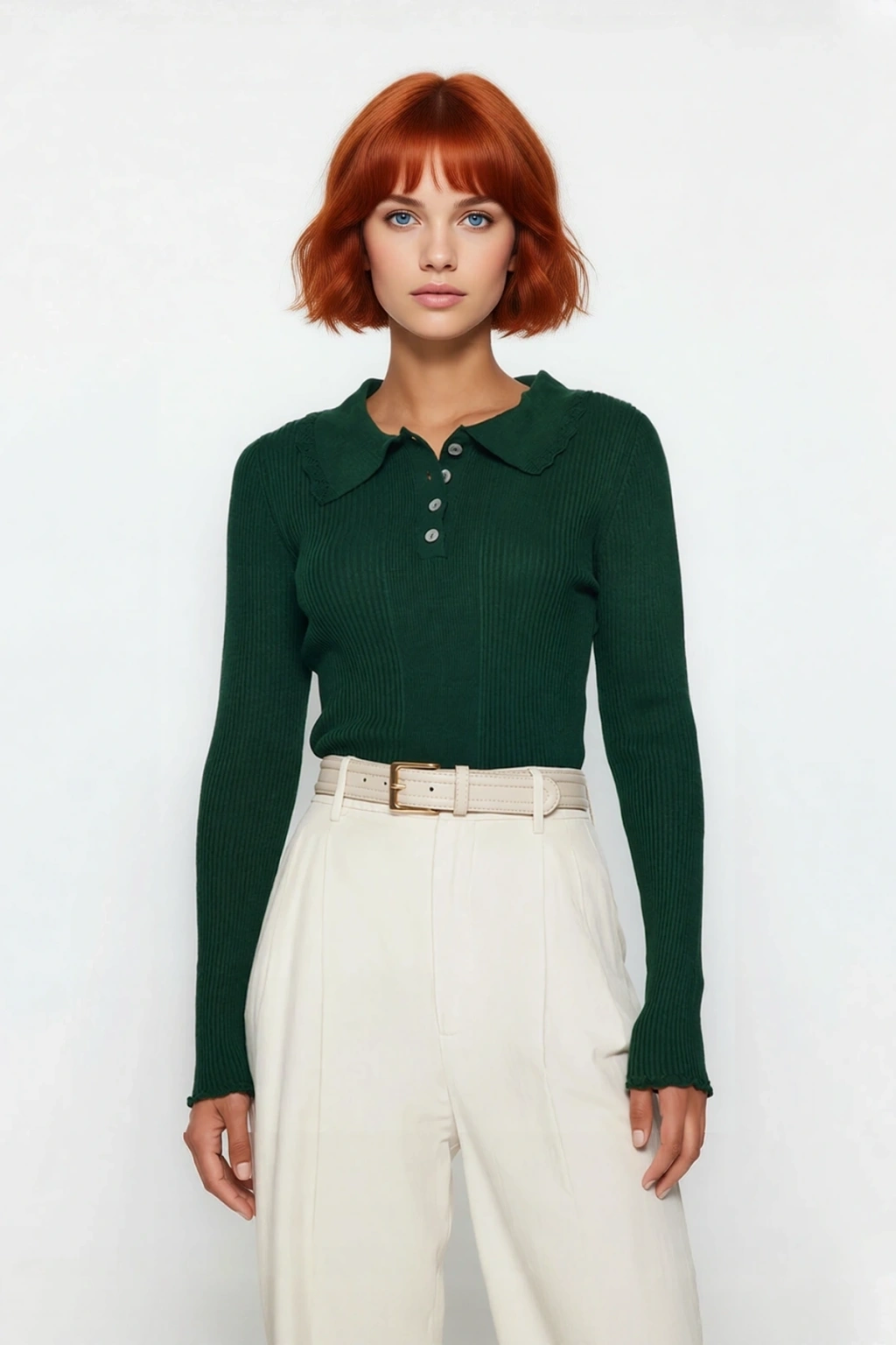Ürün Özellikleri: Fitted kalıp, akrilik materyal, düz desen, polo yaka, standart kol, triko kumaş, yeşil renk, cepsiz tasarım.