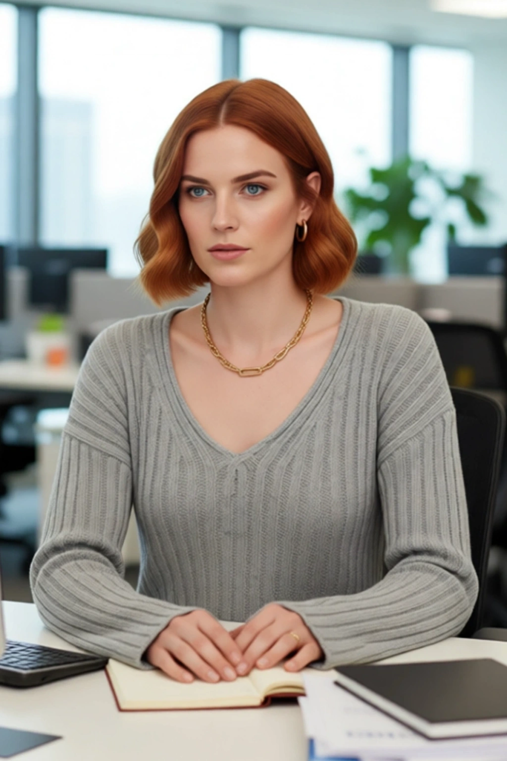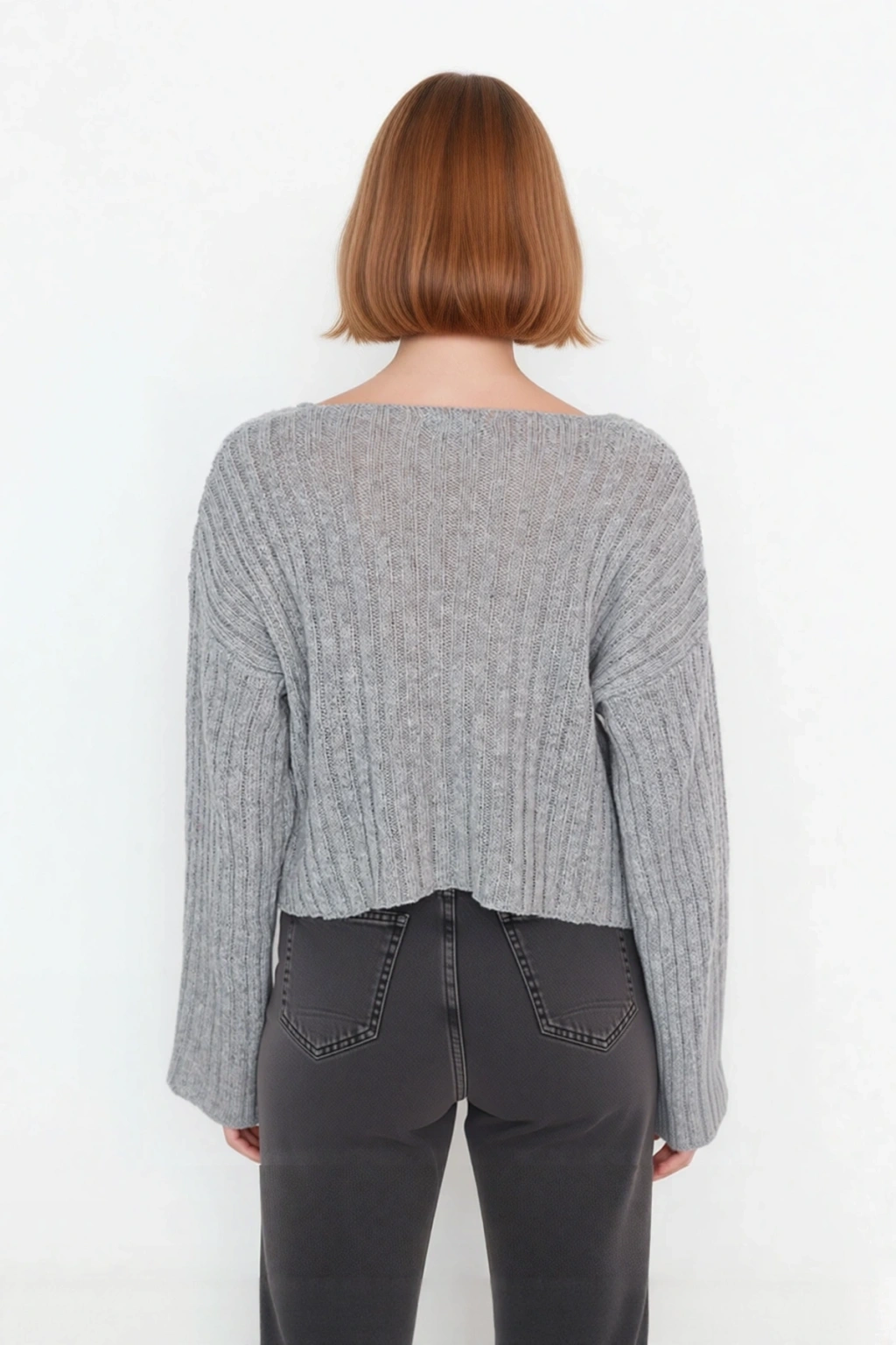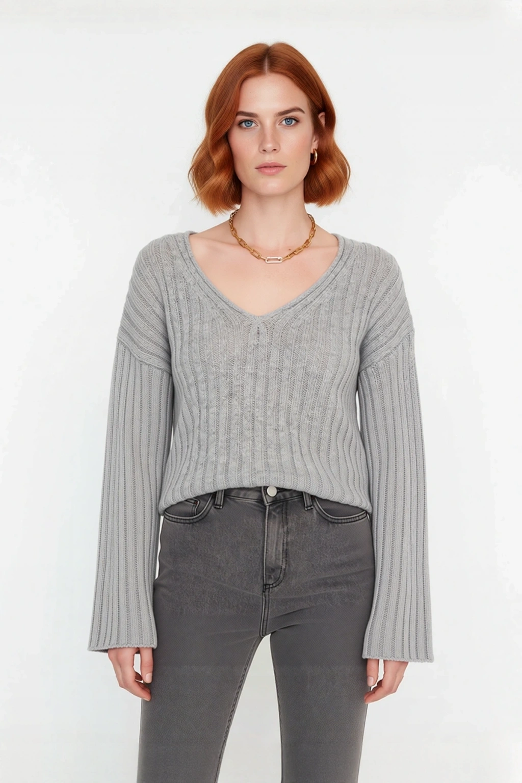Ürün Özellikleri: Geniş kalıp, yünlü materyal, düz desen, V yaka, standart kol, triko kumaş, gri renk, baskısız tasarım.
