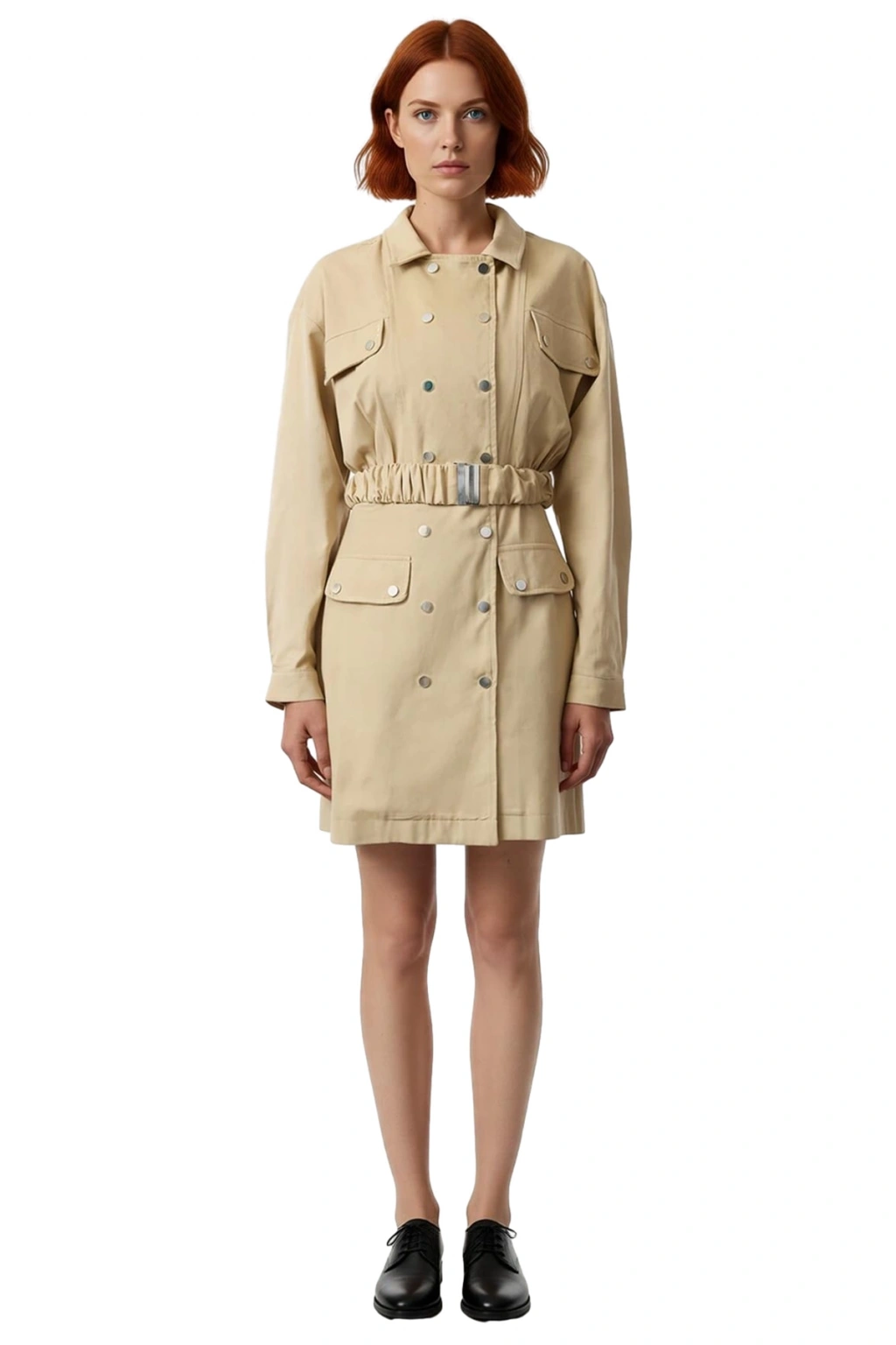 Ürün Özellikleri: Ceket elbise, %100 Pamuk, düz, ceket yaka, standart kol, gabardin, bej.