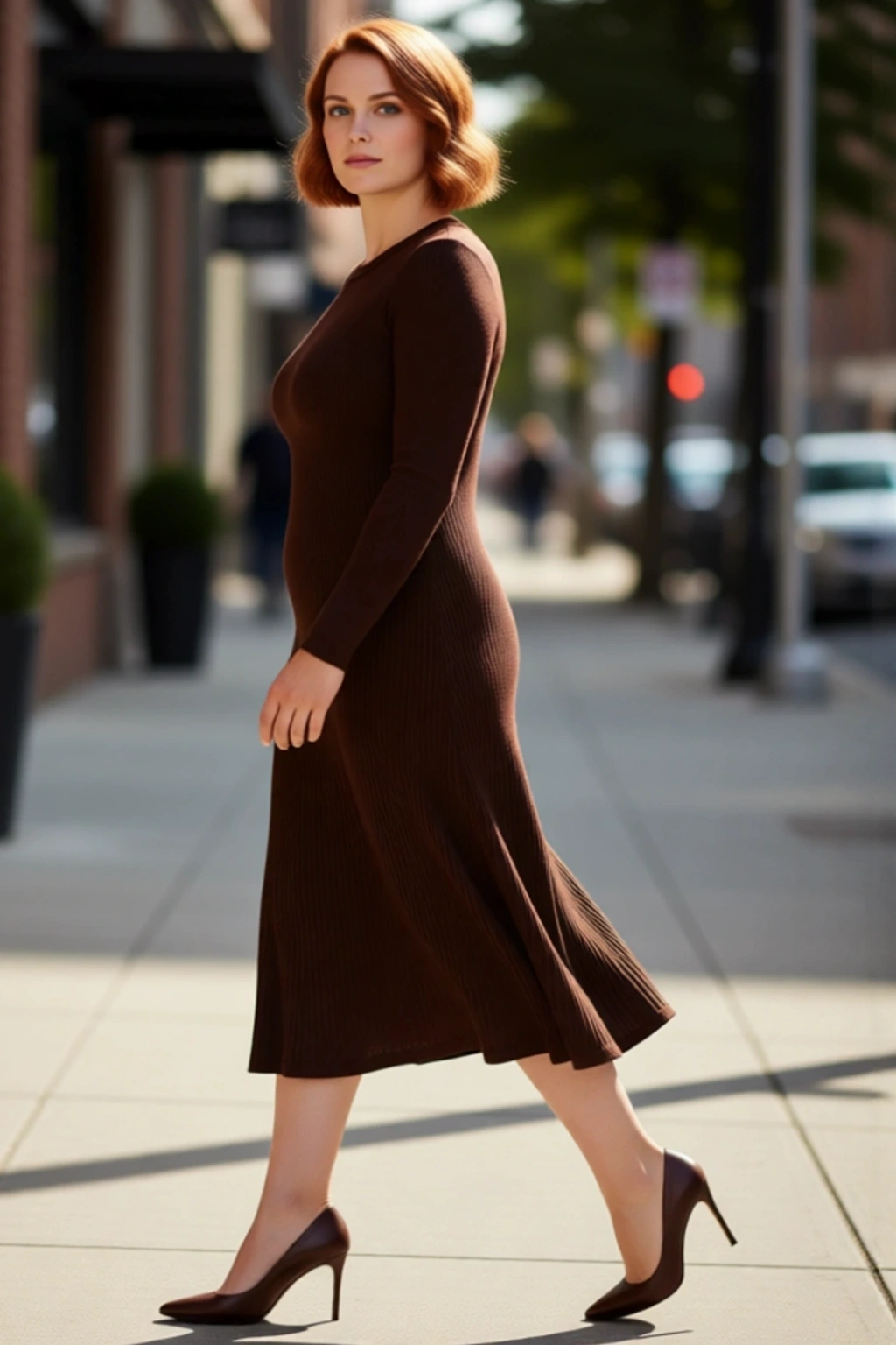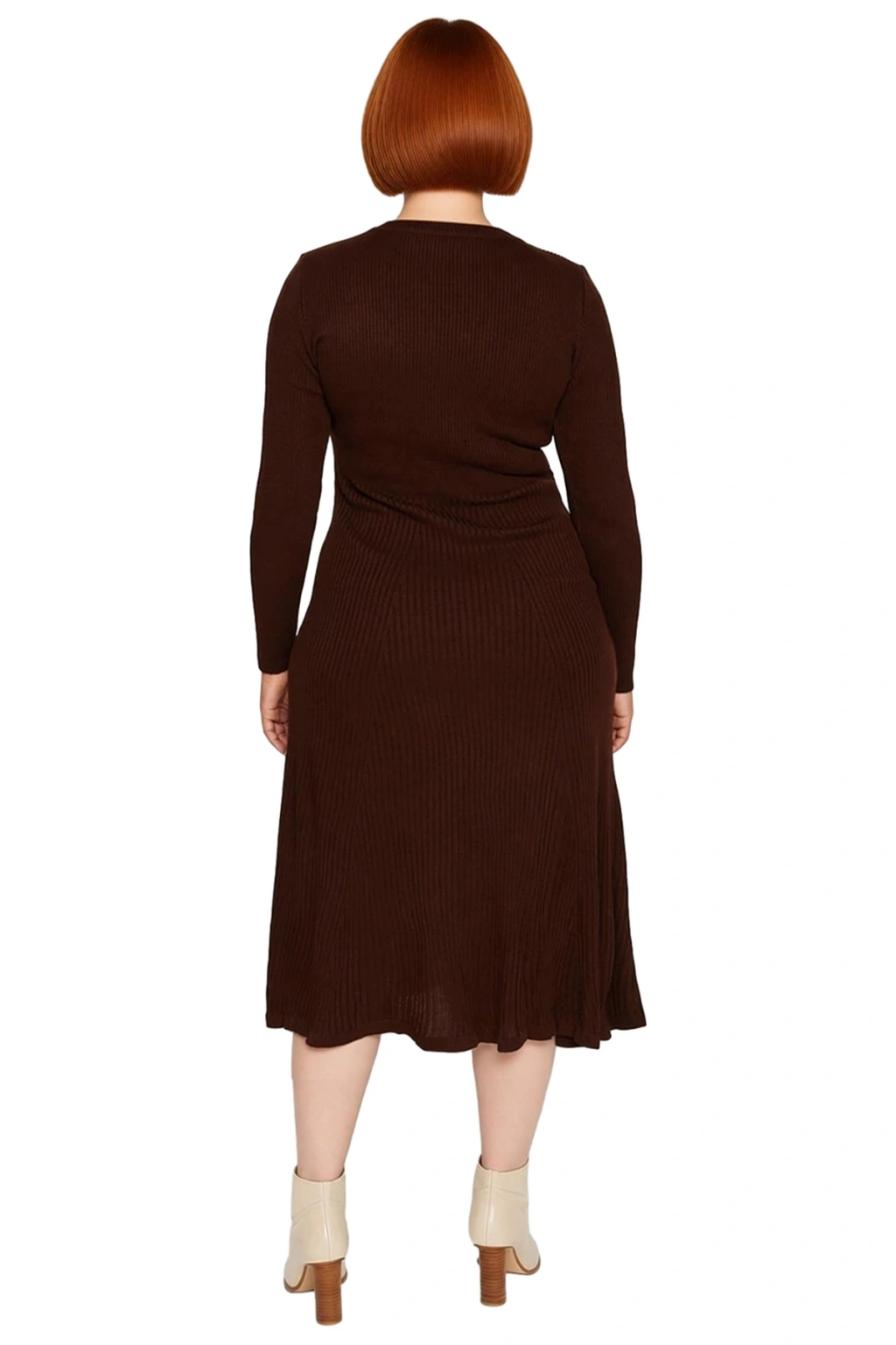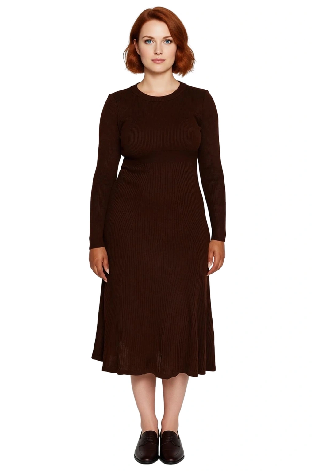 Ürün Özellikleri: A-line kalıp, akrilik materyal, düz desen, bisiklet yaka, standart kol, triko kumaş, kahverengi renk.