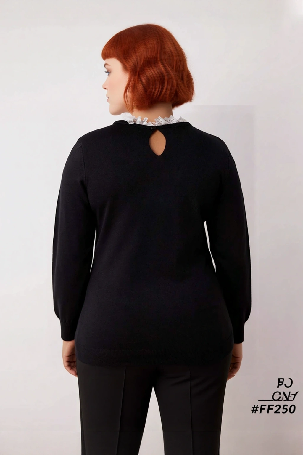Ürün Özellikleri: Regular kalıp, akrilik materyal, düz desen dantel ve kurdele detaylı, bisiklet yaka, standart kol, triko kumaş, siyah renk.
