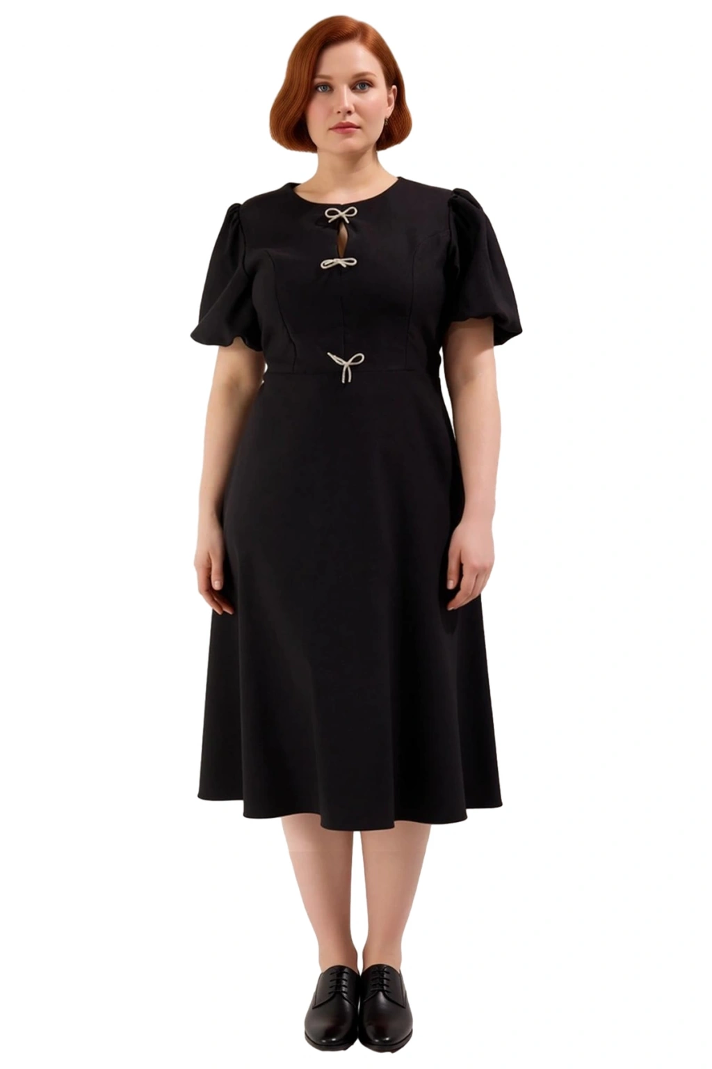 Bu zarif kadın elbisesi, skater kalıbı ile hareketli ve modern bir stil sunarken, aynı zamanda vücut hatlarını dengeleyici bir etki yaratır. %88 Polyester ve %12 Elastan karışımı materyali, gün boyu süren konfor ve esneklik sağlayarak aktif yaşam tarzınıza uyum sağlar. Düz ve klasik siyah rengi, her aksesuarla uyum içinde göz alıcı kombinler oluşturmanıza olanak tanır. Ön kısmındaki fiyonk detayları ise elbiseye sofistike ve özgün bir karakter kazandırır.