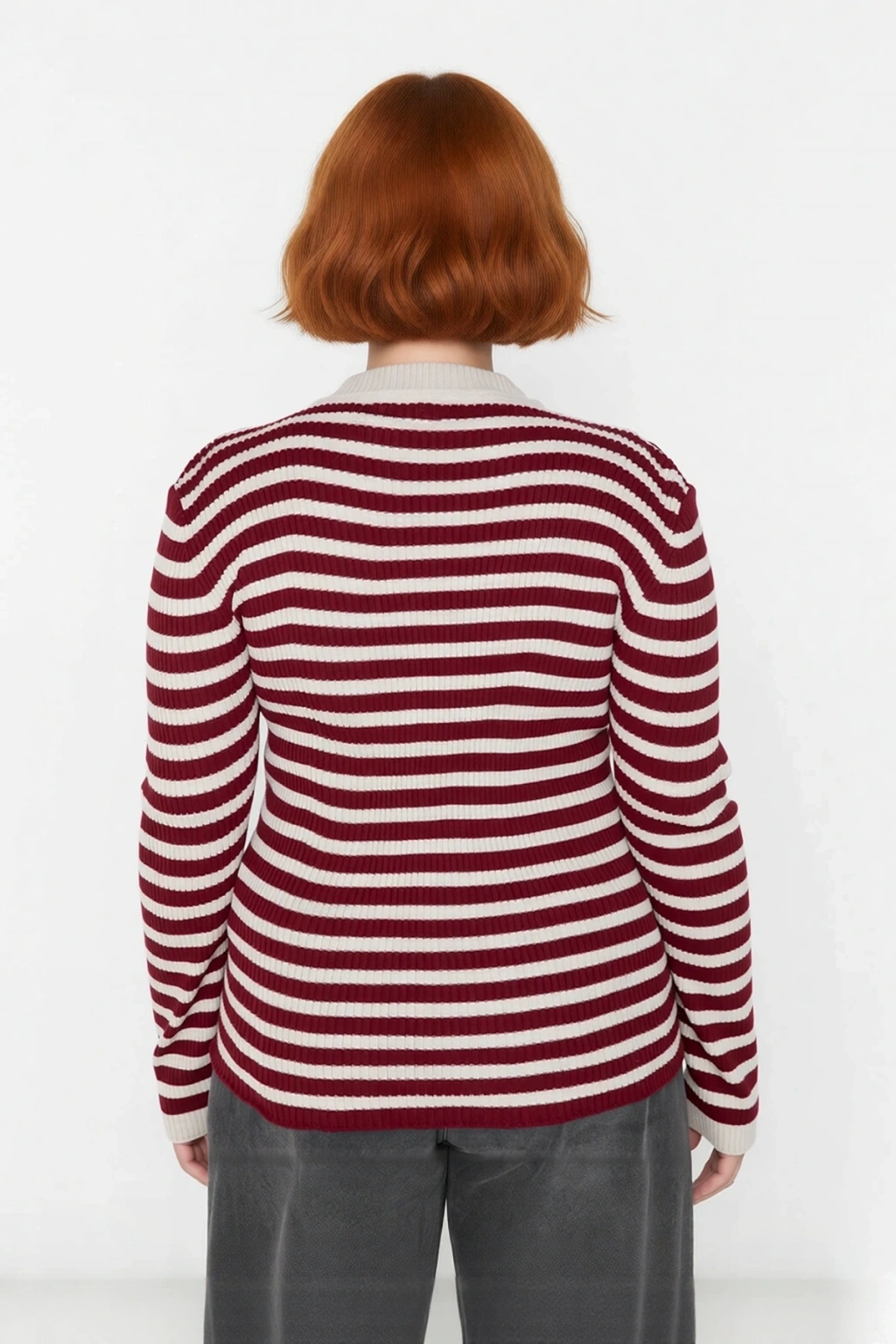 Ürün Özellikleri: Fitted kalıp, akrilik materyal, çizgili desen, bisiklet yaka, standart kol, triko kumaş, bordo ve krem çizgili renk.