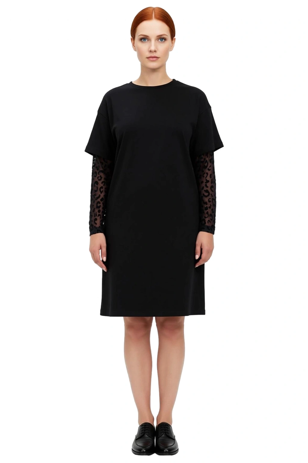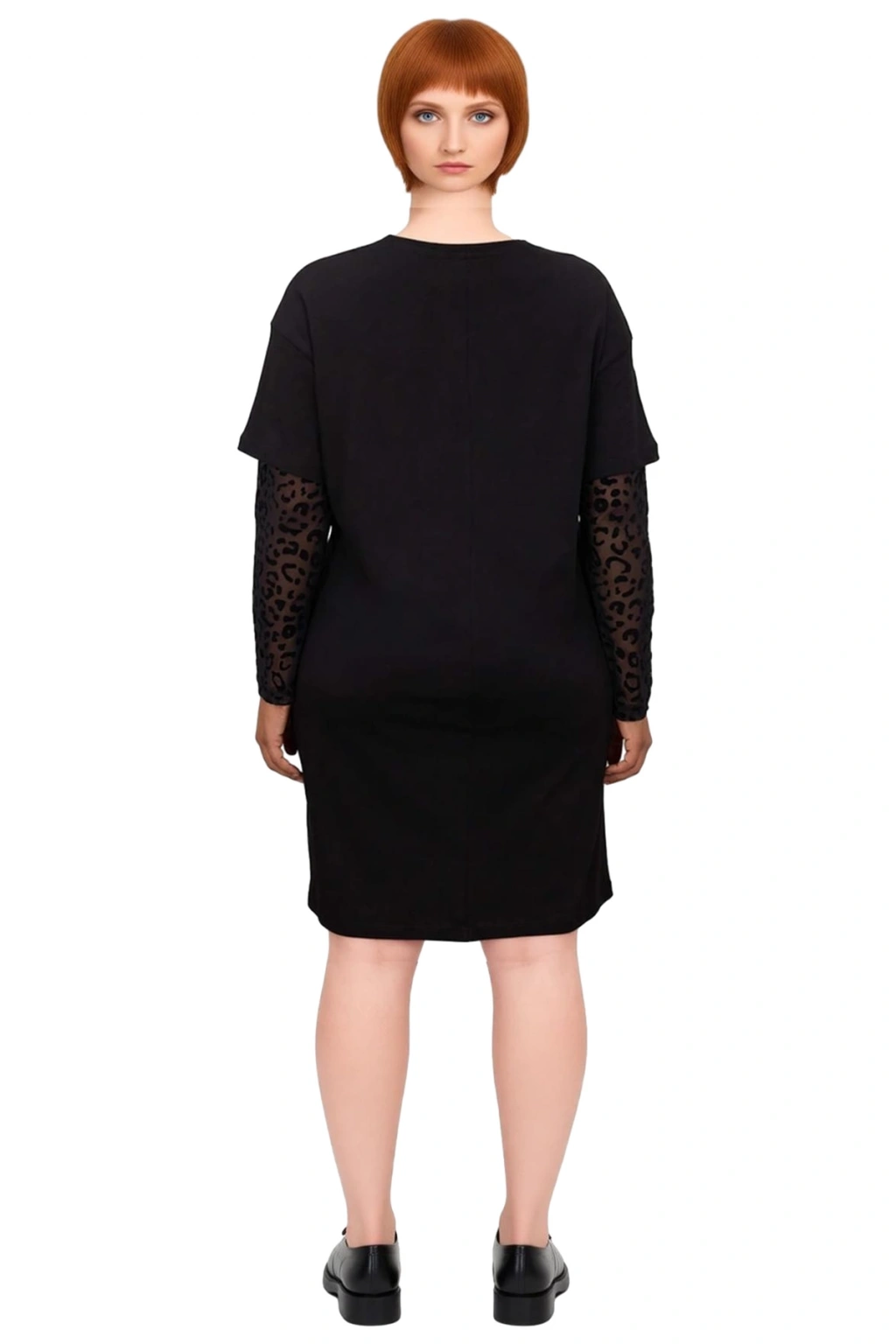 Ürün Özellikleri: T-Shirt elbise kalıp, %100 pamuk materyal, düz ana beden tül leopar desenli kol, bisiklet yaka, düşük kol uzun kol, süprem örme kumaş, siyah renk.