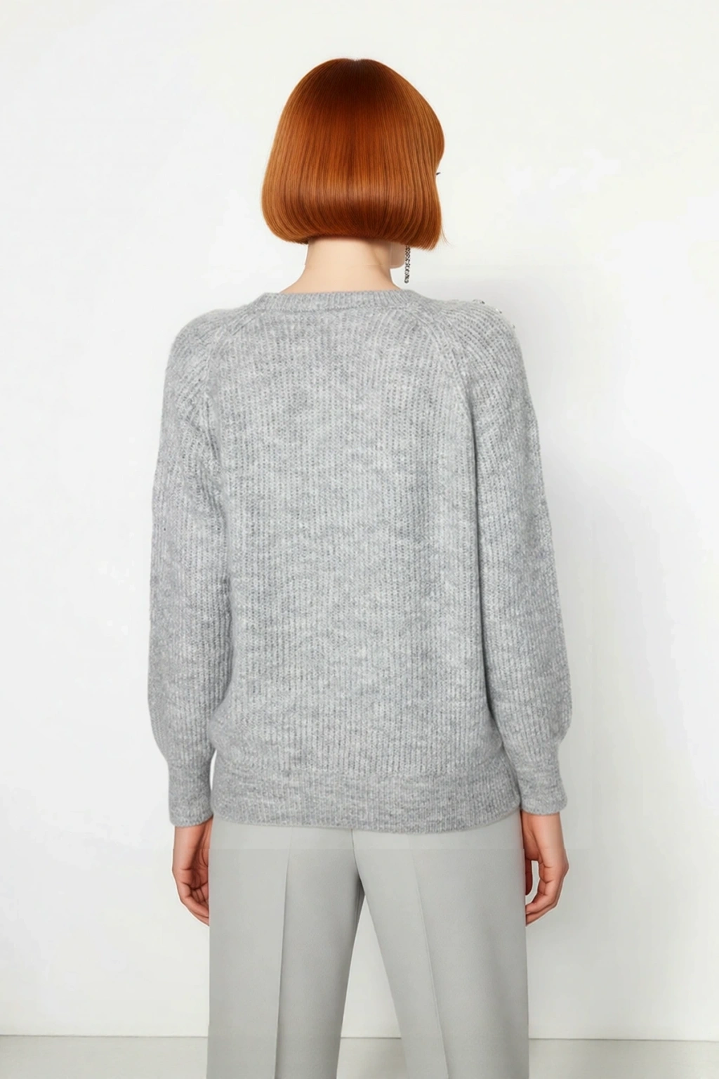 Ürün Özellikleri: Regular kalıp, %75 akrilik %25 polyester materyal, düz desen, bisiklet yaka, standart kol, triko kumaş, ekru renk, taş detaylı.