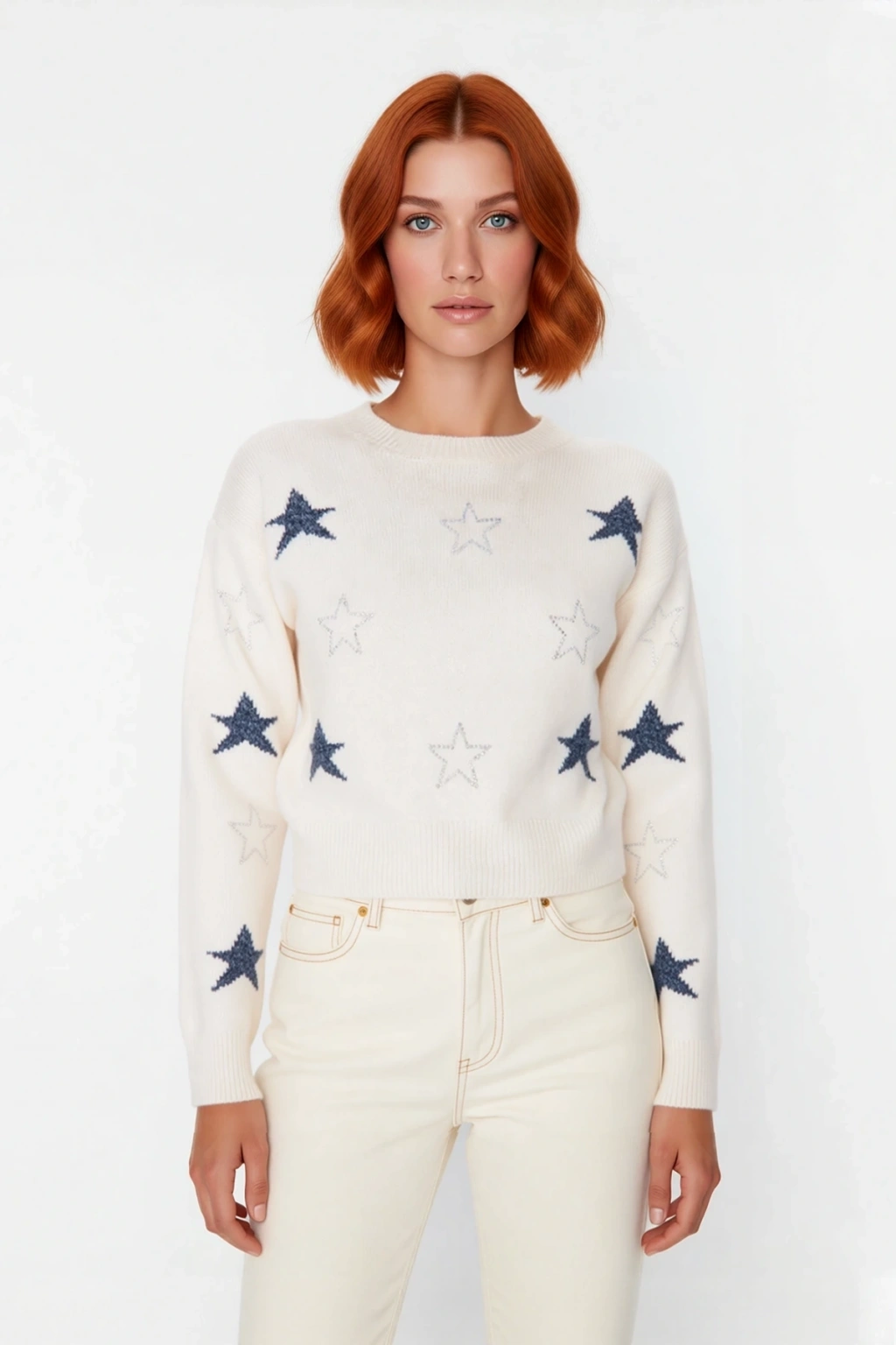 Ürün Özellikleri: Regular kalıp, %80 Akrilik %20 Polyester materyal, Yılbaşı temalı yıldız desen, bisiklet yaka, standart kol, triko kumaş, ekru renk, crop boy, cepsiz, basic siluet, fitilli dokuma.