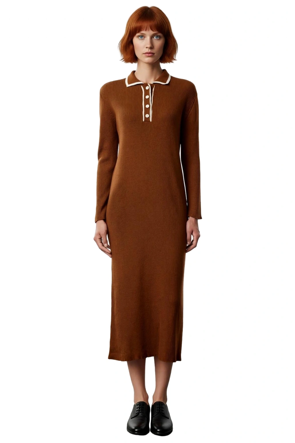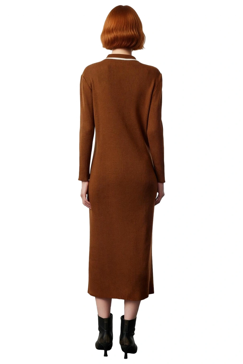 Ürün Özellikleri: Shift kalıp, %100 akrilik materyal, renk bloklu desen, polo yaka, standart kol, triko kumaş, kahverengi renk, cepsiz, maxi boy, astarsız, biyeli, kemersiz.