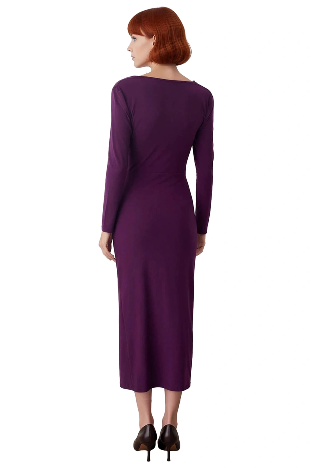 Ürün Özellikleri: Bodycon kalıp, polyester materyal, düz desen, degaje yaka, uzun standart kol, örme kalın sandy kumaş, mor renk, büzgü drape detay.