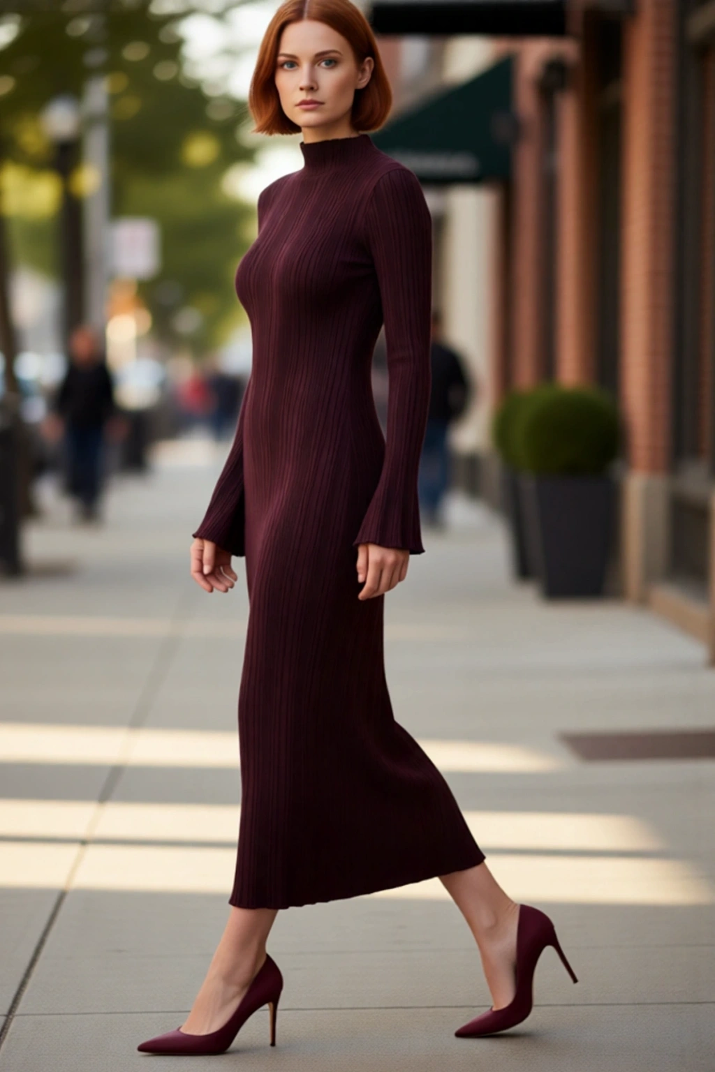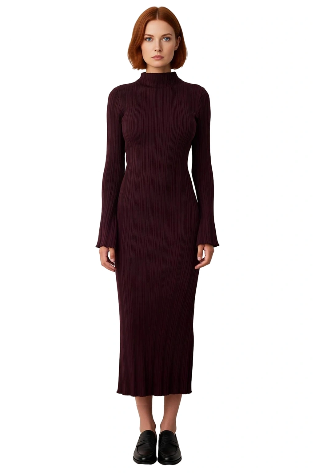 Ürün Özellikleri: Bodycon kalıp, %100 polyester materyal, düz desen, dik yaka, standart kol, triko kumaş, mor renk, maxi boy.