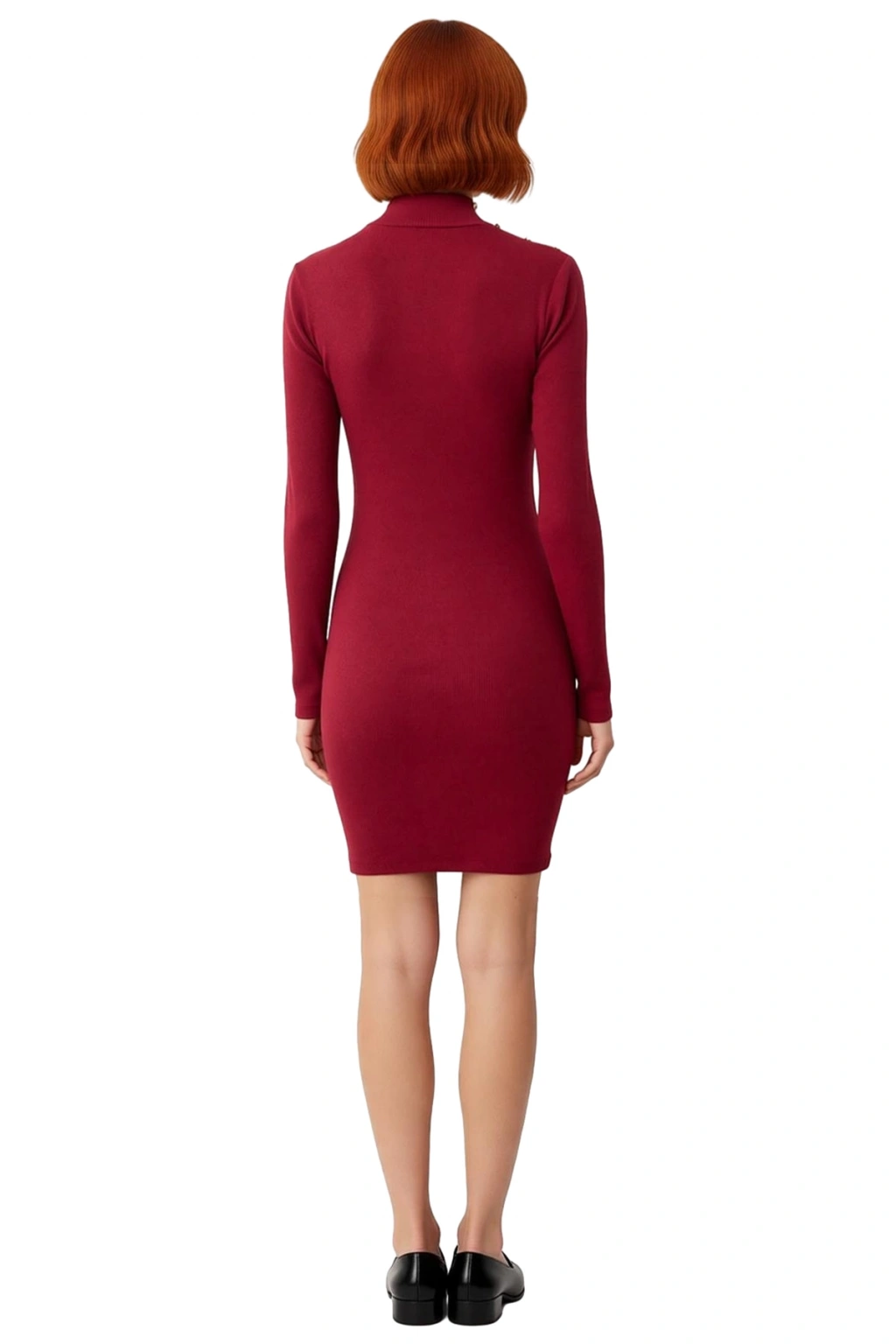 Ürün Özellikleri: Bodycon kalıp, polyester pamuk elastan materyal, düz desen, dik yaka, standart uzun kol, örme kaşkorse kumaş, bordo renk.