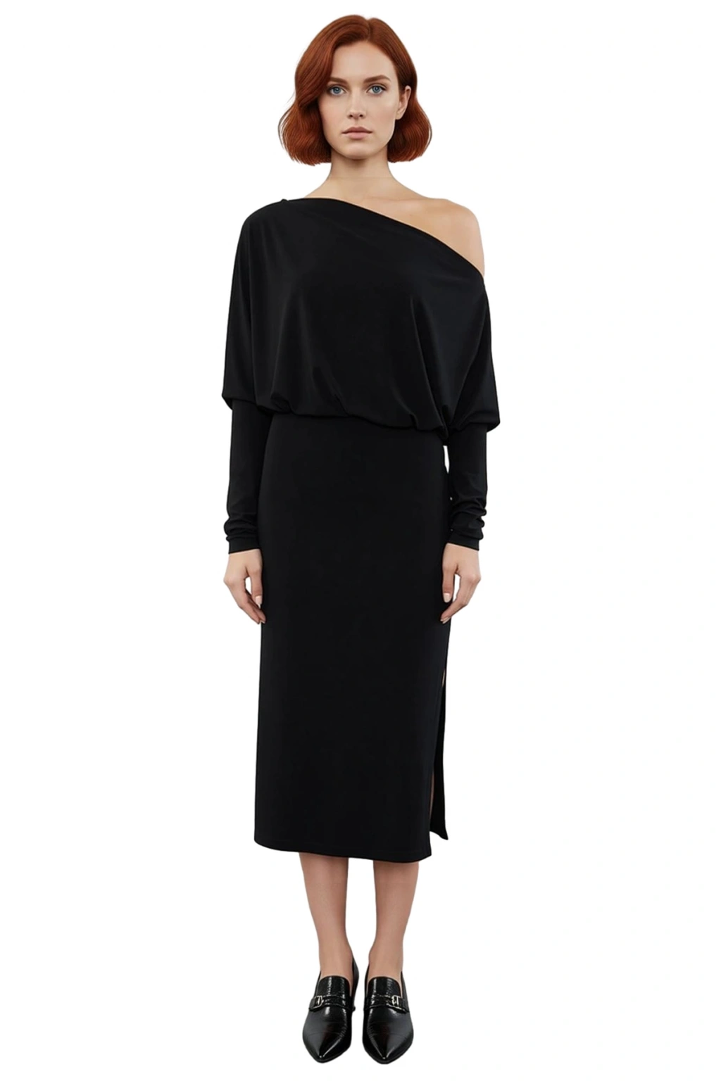 Elbisenin en dikkat çekici özelliklerinden biri olan asimetrik yaka tasarımı, omuzları zarifçe açıkta bırakarak sofistike bir dokunuş katıyor. Düşük kol tipi ve uzun kol boyu, hareket özgürlüğünü kısıtlamadan şık bir duruş sergilemenizi sağlar. Örme kumaş yapısı, dokuma tipi olarak kalın sandy özelliği ile kış aylarında bile sıcak tutarken, yumuşak dokusuyla cildinize narin bir his verir. Midi boyu ve bacakta yer alan yırtmaç detayı, modern bir hava katarken adımlarınıza hareketlilik katar. Astarsız olmasına rağmen iç göstermeyen yapısıyla güvenli bir kullanım sunar. Yüksek oranda polyester ve elastan içeren kumaşı sayesinde formunu uzun süre korur ve kolayca yıpranmaz. Makinede yıkanabilir özelliği ile bakımı da oldukça pratiktir.